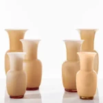 Nasce così la nuova capsule collection Pesca, dalle sfumature morbide e gentili, che veste gli iconici vasi Fazzoletto, Deco, Monofiore Balloton, Balloton Fiori, Opalino, i vasi d’autore Ritagli, Battuto a Nido d’ape, Acco, Idalion e Sidone e le nuove lampade da tavolo Fantasmino XL, Gran Deco Luce e Gran Balloton Luce di riflessi rosati e arancio. Una tonalità avvolgente che infonde sensazioni di serenità, dolcezza ed armonia. Poetica e romantica, la collezione Pesca di Venini mixa un’elegante aria vintage, con un tocco contemporaneo.