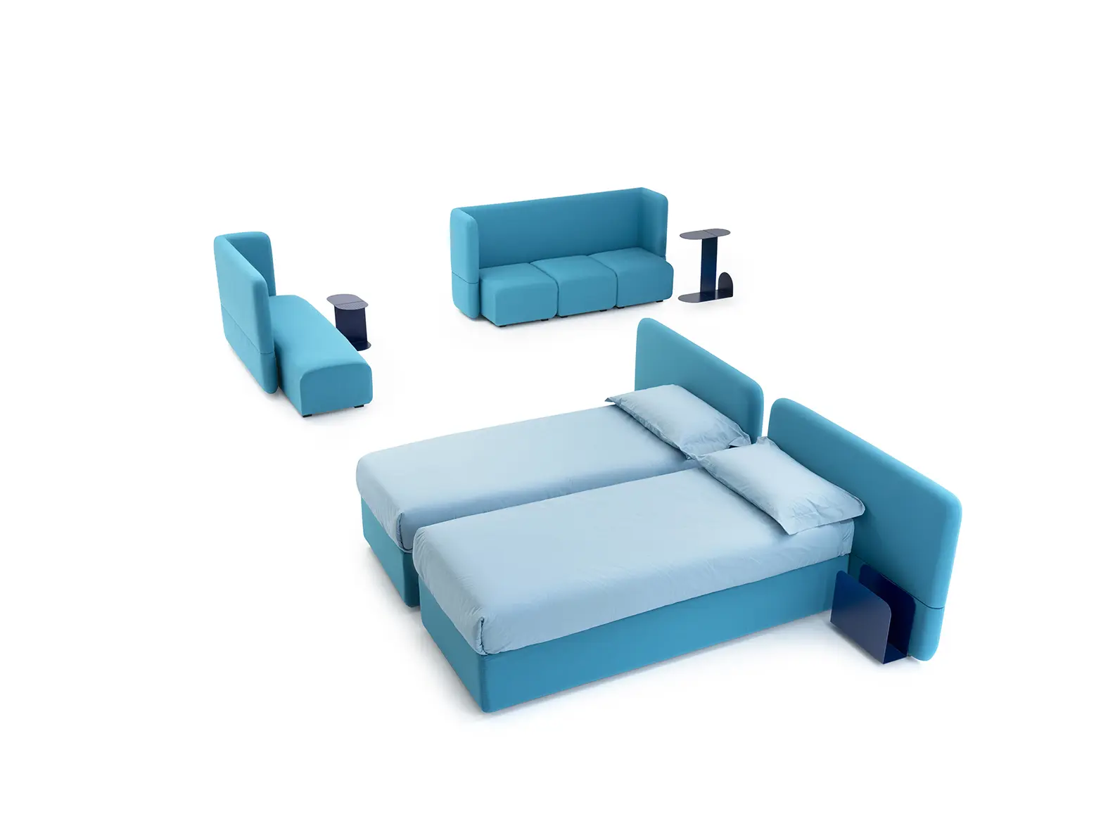 Si tratta di un percorso nuovo non solo nell’estetica ma anche nell’espressività funzionale: i diversi moduli che lo compongono offrono la possibilità di numerose configurazioni, da letto singolo a matrimoniale, da proposta centro stanza a divano per il living. Una ricca gamma di accessori rende la proposta in grado di rispondere alle esigenze di spazi più efficienti, vivibili e integrati tra loro.