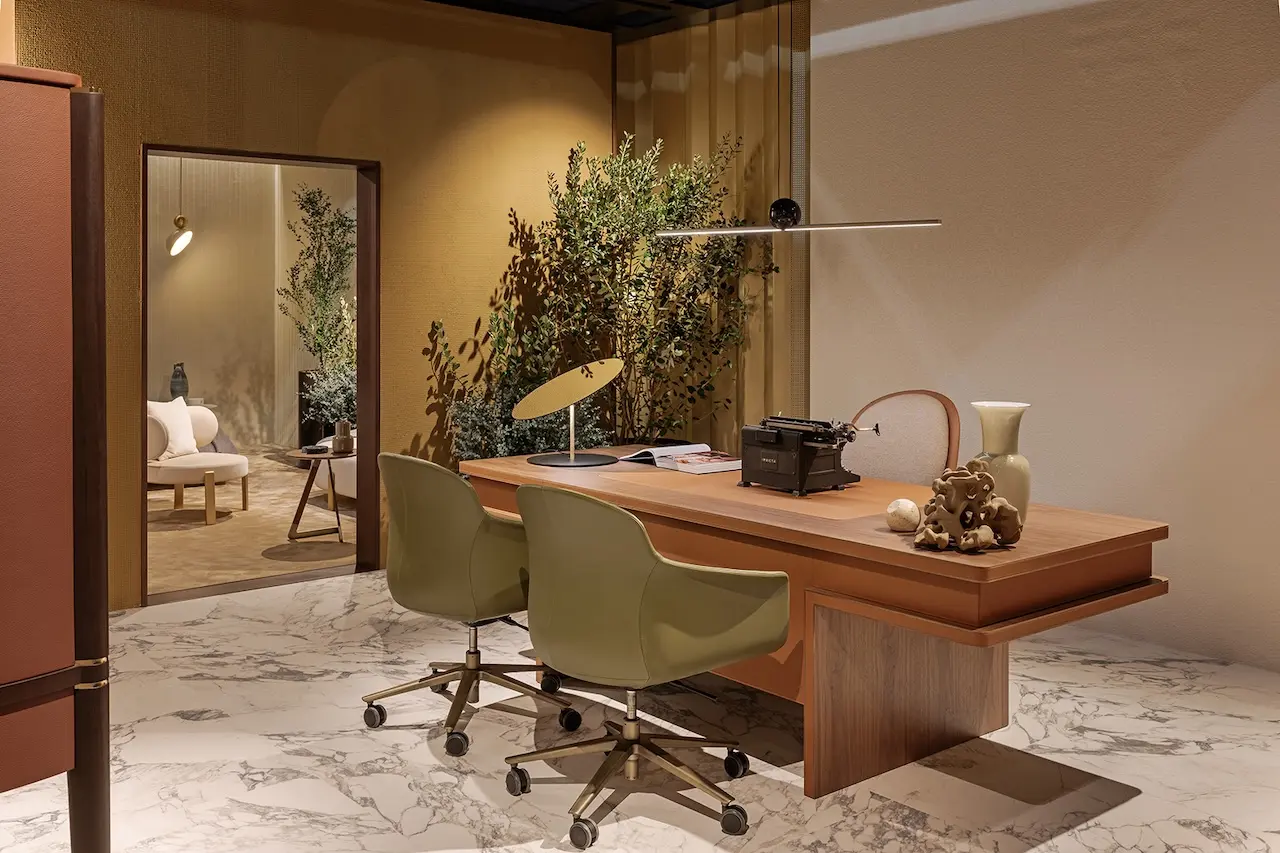 Una base compatta che sorregge non solo l’esperienza delle persone che occuperanno questa scrivania, ma riflette anche l’impegno e la dedizione di Turri nell’offrire arredi di alta qualità. Accanto al desk, la comoda poltrona direzionale della collezione Echo. Una seduta ampia e accogliente