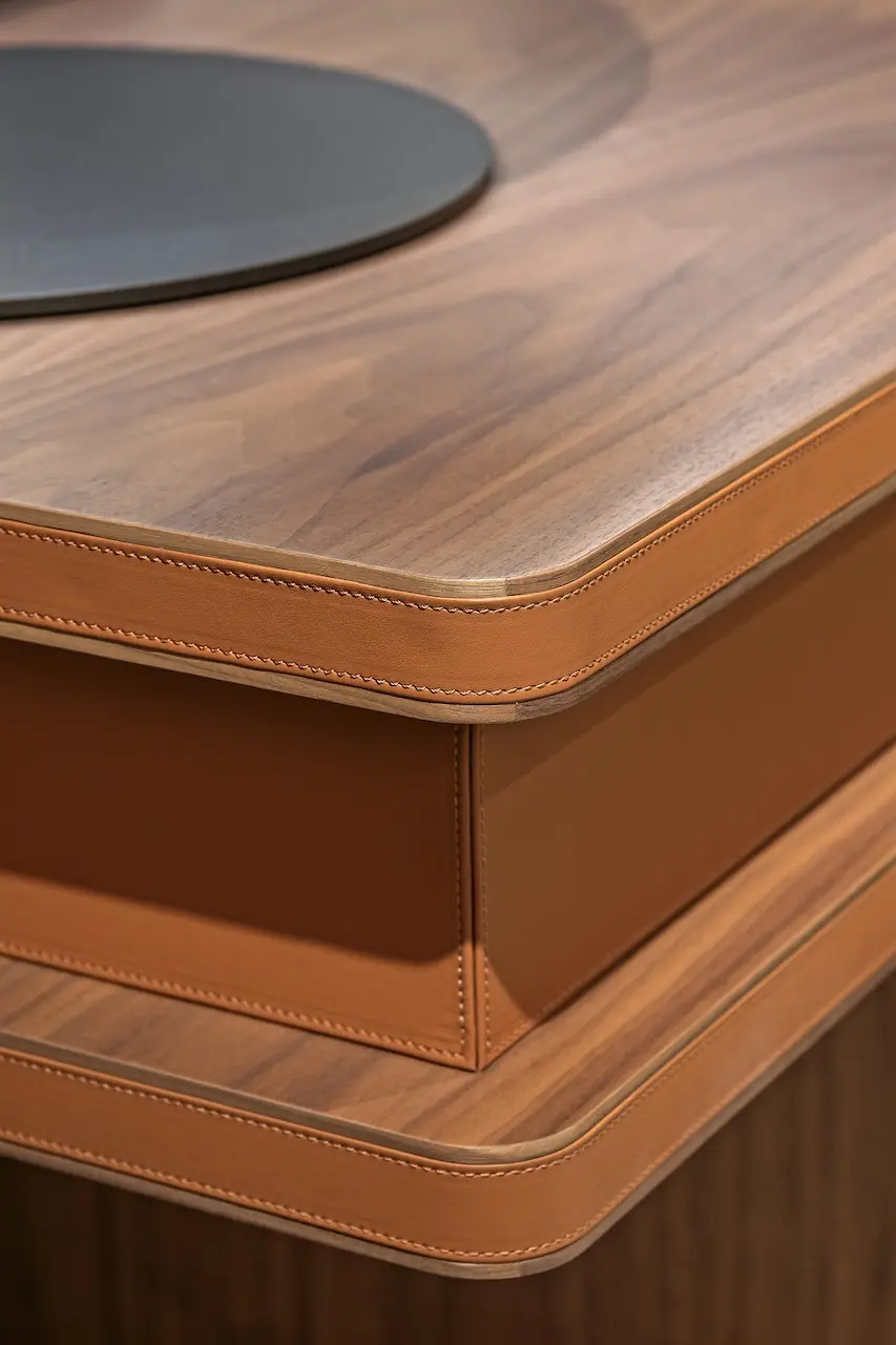 senza tempo. Quello interpretato da Echo è un ufficio che va oltre la mera funzionalità, abbracciando anche l’estetica con un equilibrio perfetto. La fusione di curve sinuose e la versatilità degli arredi crea un’atmosfera accogliente e ispiratrice, progettata per stimolare la creatività e migliorare l’efficienza dei professionisti che lo abitano. Nel nuovo ufficio presentato da Turri, il desk diventa l’elemento centrale dello spazio lavorativo. Gli angoli arrotondati si sdoppiano: il top in legno di noce con sottomano in pelle è caratterizzato da queste rotondità che, in prossimità dello spigolo, sfumano delicatamente simulando due piani distinti all’interno della scrivania. Questa progettazione offre una solida base per svolgere le attività quotidiane e, al contempo, un ottimo contenitore, con cassetti rivestiti in pelle, per documenti e materiali da ufficio, ottimizzando spazio e organizzazione per agevolare la produttività professionale.
