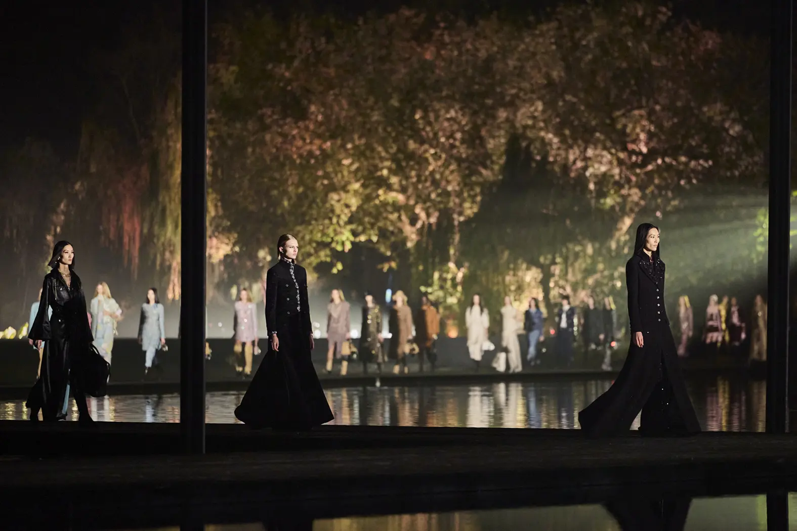 Verde giada, rosa e azzurro cielo evocano la brillantezza della loro lacca. Jeans blu sbiaditi richiamano le increspature sulla superficie dell’acqua del lago, mentre il nero, il marrone e i toni più scuri rimandano al legno dei pannelli e ai passi vellutati nella notte. Le calzature sono stivali alti fino alla coscia e pantofole a punta in vernice nera, così come comodi stivali a metà polpaccio realizzati da Massaro, come quelli preferiti da Gabrielle Chanel. Alcuni sono riflettenti con i ricami più notevoli di Lesage. Fiori, frutti (un omaggio all’antico prunus dalla Cina), costole create dal passare del tempo sulla superficie di oggetti in terracotta ispirano medaglioni e polsini realizzati da Goossens.