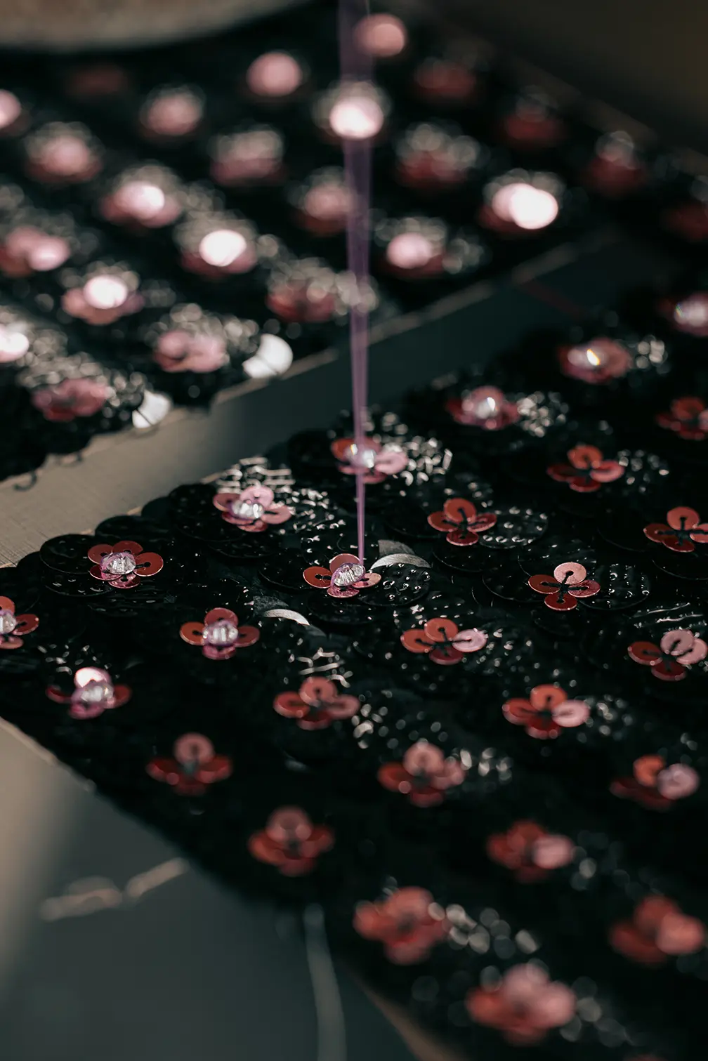 I tweed sviluppati dal dipartimento di design tessile di Lesage richiamano le ricche tonalità dei paraventi Coromandel e i riflessi della loro lacca. Per la sua ricerca innovativa di nuovi materiali e texture, l’Atelier di ricamo Montex, fondato a Parigi nel 1949, spinge i confini dell’immaginazione per ogni sua creazione. Per questa sfilata, Montex ha creato una treccia ricamata con fiori in filo fosforescente, dipinta a mano per dare un effetto ombra, e che ha preso vita durante lo spettacolo presentato al calar della notte sul lago Xihu.