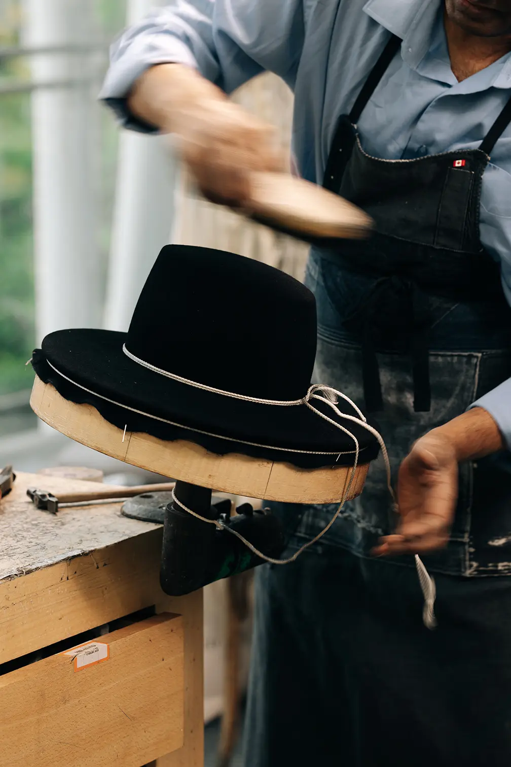 Parte di Lemarié dal 2013, anche gli artigiani di Lognon hanno contribuito con la loro virtuosa plissettatura alla collezione. Una giacca in raso di seta bianco sporco plissettata da Lognon e poi arricciata e perlinata da Lemarié ha combinato due pieghe piatte che variavano in larghezza e orientamento per creare un effetto trapuntato 3D. L’abito che ha chiuso la sfilata combinava due tipi di plissettatura, sunburst e ‘au bonheur des dames’, impreziosito da Lemarié con intarsi di pizzo, filo di lurex e perline dorate che formavano grandi camelie. Laboratorio creativo in continua evoluzione, la modista e cappellaia Maison Michel è stata fondata nel 1936 da Auguste Michel e acquisita da CHANEL nel 1997.