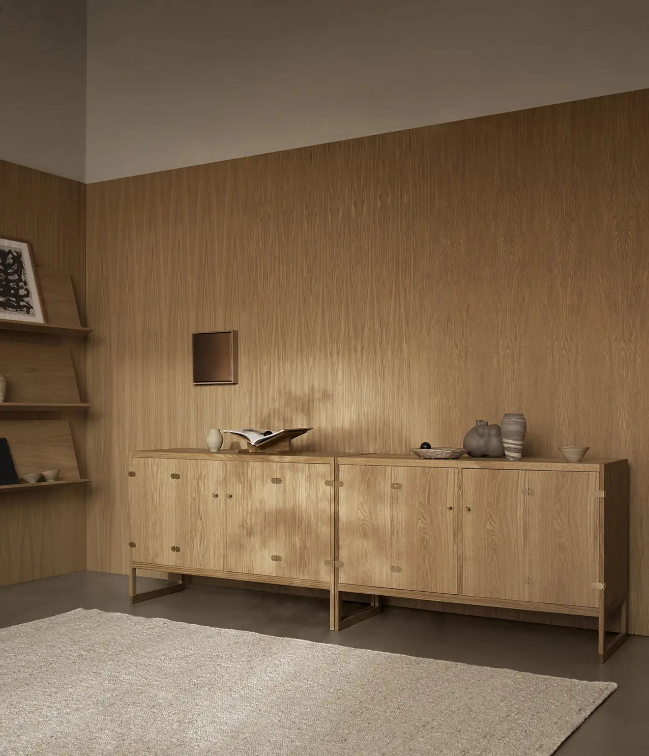I mobili classici disegnati da Børge Mogensen (1914-1972) fanno parte della collezione di Carl Hansen & Son dal 2018. Oggi, l’azienda sta ampliando la sua collezione includendo la madia di Mogensen, la BM0057, del 1957. La credenza si distingue per l’esclusiva ebanisteria in rovere e ottone; tuttavia, Børge Mogensen ha cercato di evitare uno stile troppo appariscente. Il designer ha ottenuto questo equilibrio lasciando che i materiali parlassero da soli, senza inutili decorazioni, concentrandosi invece sull’aggiunta di diversi dettagli funzionali.