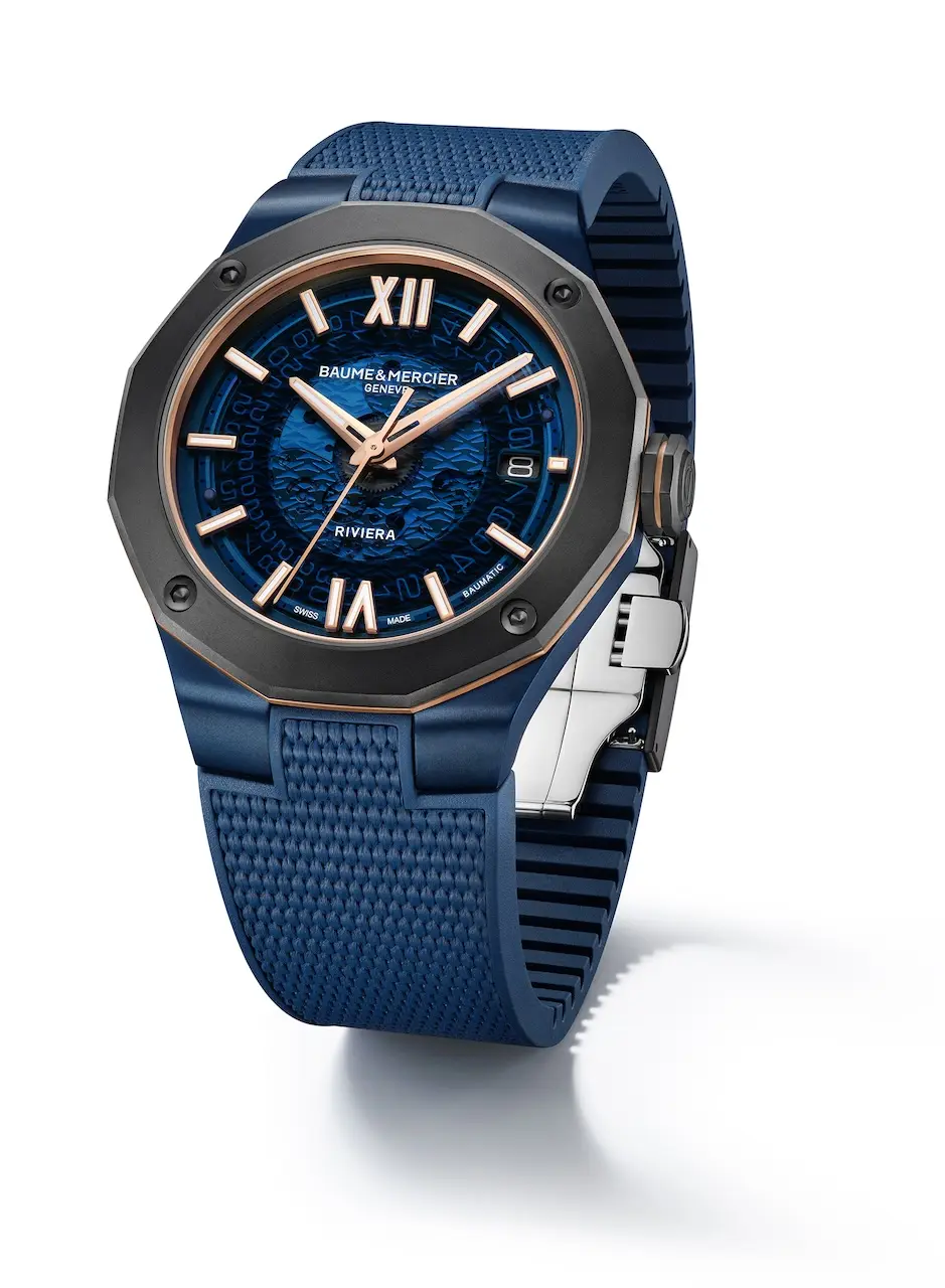 Sul quadrante in vetro zaffiro blu fumé è ripresa l’iconica decorazione a onde trasparenti del Riviera. Vi trovano posto numeri romani e indici dorati rivettati con rivestimento in Superluminova bianca ad emissione blu e lancette di ore e minuti dorate sfaccettate, anch’esse con lo stesso rivestimento. La lancetta dei secondi è dorata. La data appare in un datario grande a ore 3.