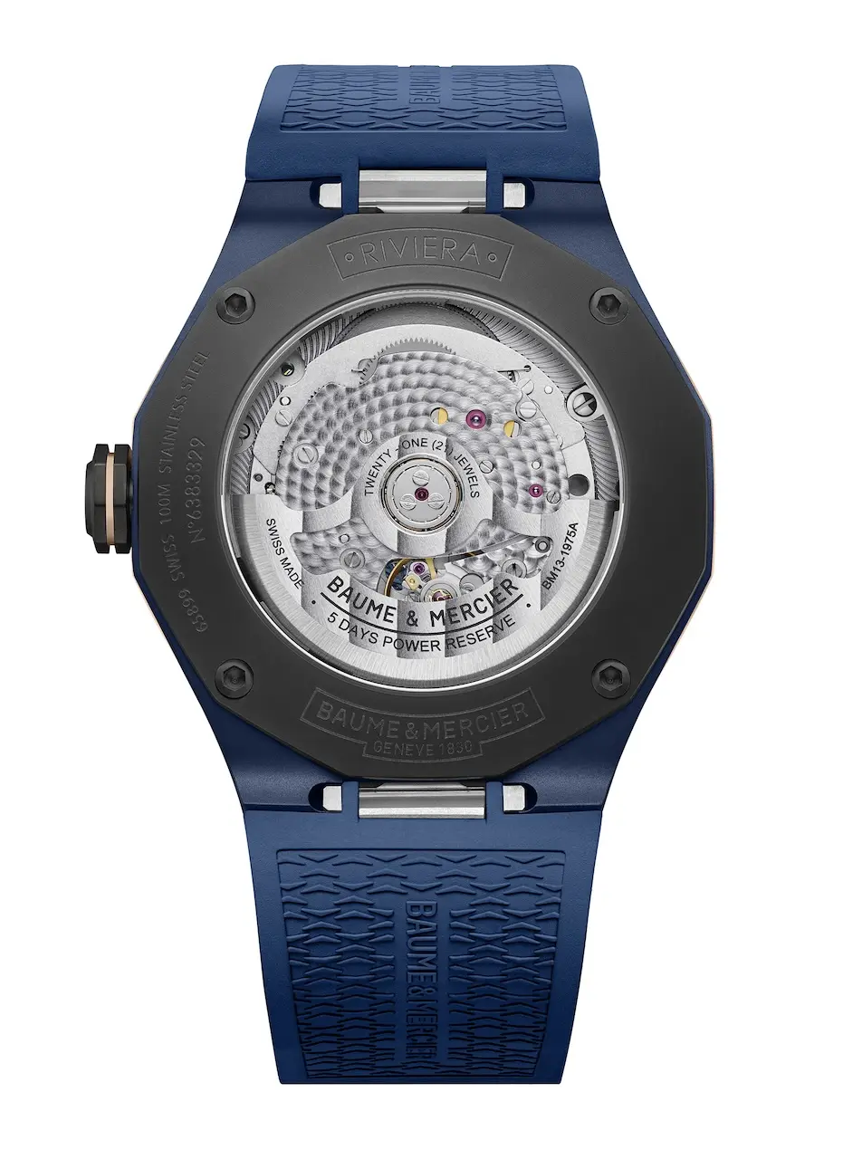 Dotato di un movimento automatico di Manifattura Baumatic, il Riviera Acciaio-Titanio offre una notevole precisione, una riserva di carica di 5 giorni (120 ore) e una protezione contro i campi magnetici presenti nella vita quotidiana. Un’estensione di garanzia di 6 anni si aggiunge a quella standard internazionale di 2 anni per una copertura totale di 8 anni, registrandosi sul sito di Baume & Mercier. L’orologio ha una frequenza di 4 Hz (28.800 alternanze/ora) ed è impermeabile fino a 10 ATM (circa 100 m). Di grande raffinatezza, le finiture presentano ponti con decoro a perlage, platina sabbiata e rifinita con motivi colimaçon, massa oscillante traforata con motivi Côtes de Genève a finitura colimaçon ed esclusiva incisione Baume & Mercier.