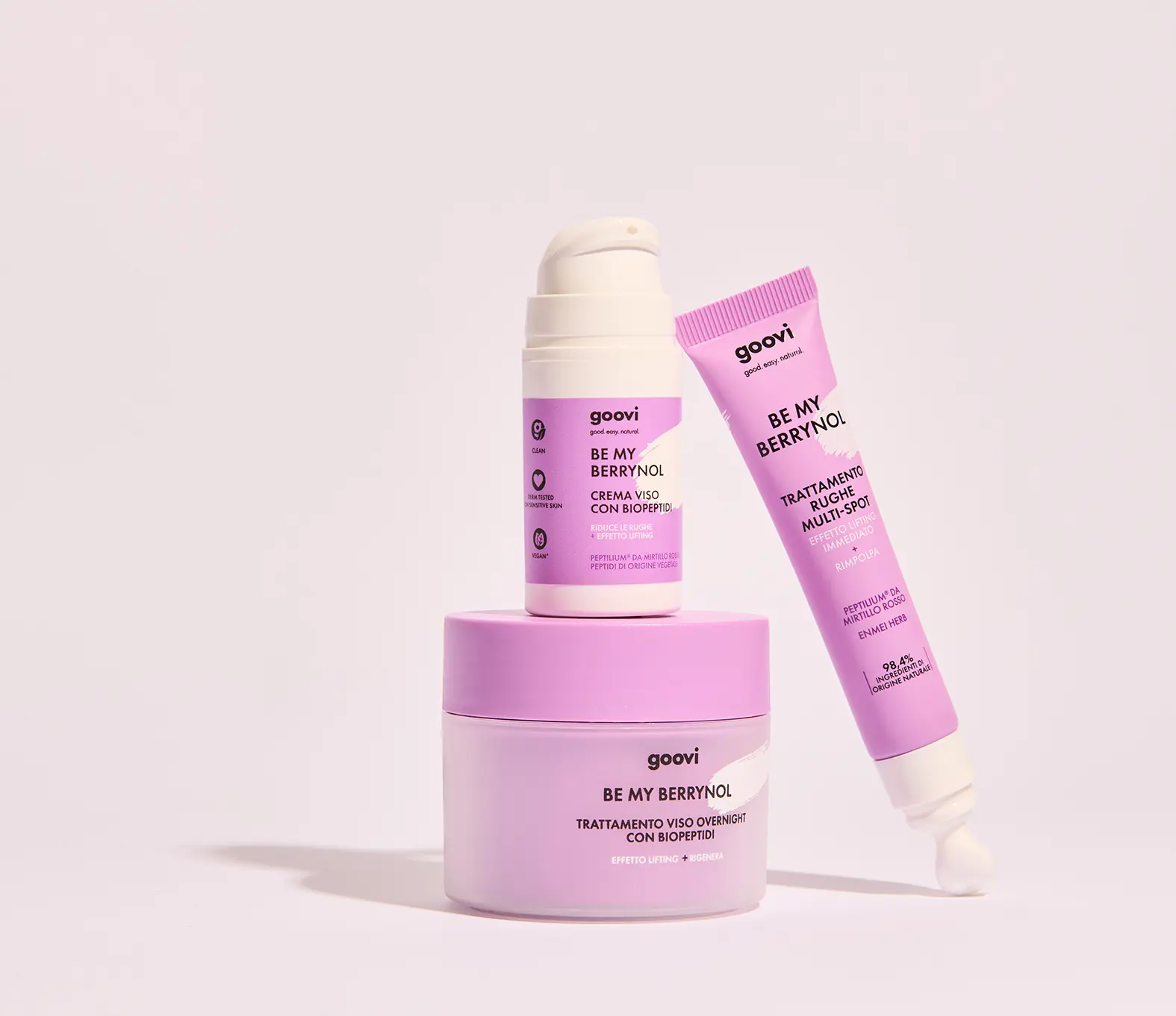goovi presenta tre nuove referenze che vanno ad ampliare la gamma BE MY BERRYNOL, pro-age e con ingredienti Retinol-like, per una pelle compatta e levigata. La linea BE MY BERRYNOL, dopo il Siero Viso e la Crema Viso, entrambi arricchiti da Peptilum ® da mirtillo rosso e Biopeptidi, si completa con i nuovissimi Integratore Alimentare Bellezza Pelle, Trattamento Multi-Spot e l’esclusivo Trattamento Overnight, completando così un percorso per una pelle dall’aspetto disteso e radioso.