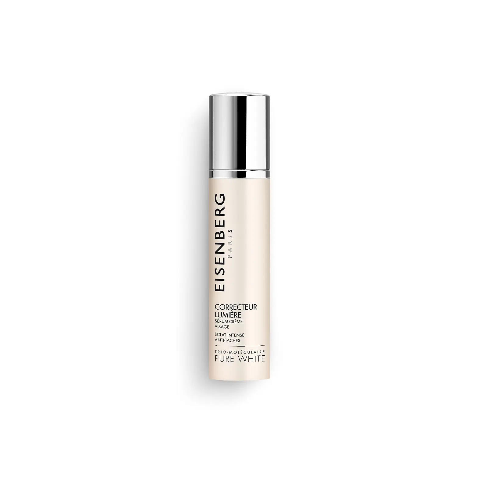 La risposta da parte di Eisenberg è stata la linea Pure White, sviluppata per rispondere alle esigenze di tutte le donne che vogliono prevenire e correggere le macchie brune della pelle dovute al sole, e riacquistare una pelle uniforme e luminosa attraverso formule innovative e textures sensoriali per un comfort estremo e risultati eccezionali. Un esempio è il Siero cremoso CORRECTEUR LUMIÈREspeciale luminosità intensa anti-macchie brune. E’ un trattamento intensivo e anti-età per contrastare le macchie o ritrovare un aspetto luminoso e perfetto della pelle. Questa formula siero-cremosa concentrata in estratto floreale di Bellis Perennis e di Vitamina C agisce in modo mirato per uniformare la melanina e per rivelare un incarnato più chiaro e luminoso. Agisce contro la formazione di macchie pigmentarie. La Vitamina E previene gli effetti nocivi della luce e dell’ossidazione cellulare. Si applica mattina e sera localmente o su tutto il viso, collo e decolleté, prima del trattamento abituale. Adatto a tutti i tipi di pelle, in particolare la pelle con macchie scure e segni di pigmentazione.
