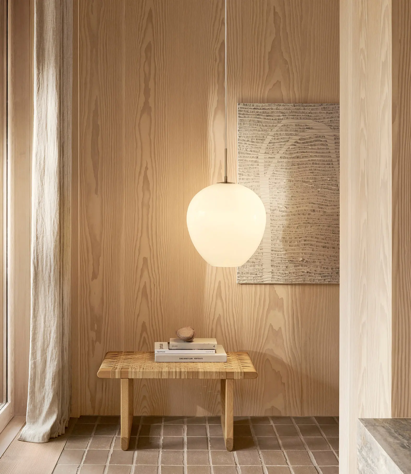 Il paralume, soffiato a bocca in tre strati di vetro, propaga una luce uniforme e priva di riflessi, mentre la piccola apertura sul fondo illumina l’ambiente verso il basso. L’asta di sospensione, in ottone massiccio, è progettata per abbinarsi al paralume in modo da formare un insieme perfetto e organico.