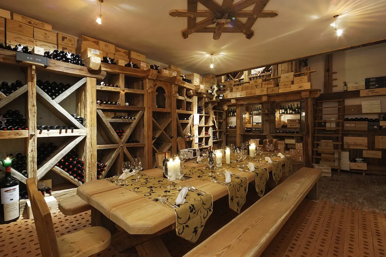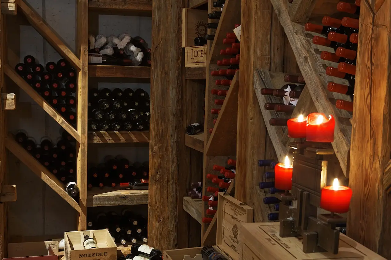 Per accedervi, gli ospiti percorrono un lungo corridoio illuminato dalla luce calda delle candele, un preludio perfetto all’esperienza che li attende. All’interno, la cantina è suddivisa in celle organizzate secondo un percorso geografico che segue l’Italia da nord a sud, permettendo agli ospiti di esplorare la ricchezza del patrimonio vitivinicolo nazionale.