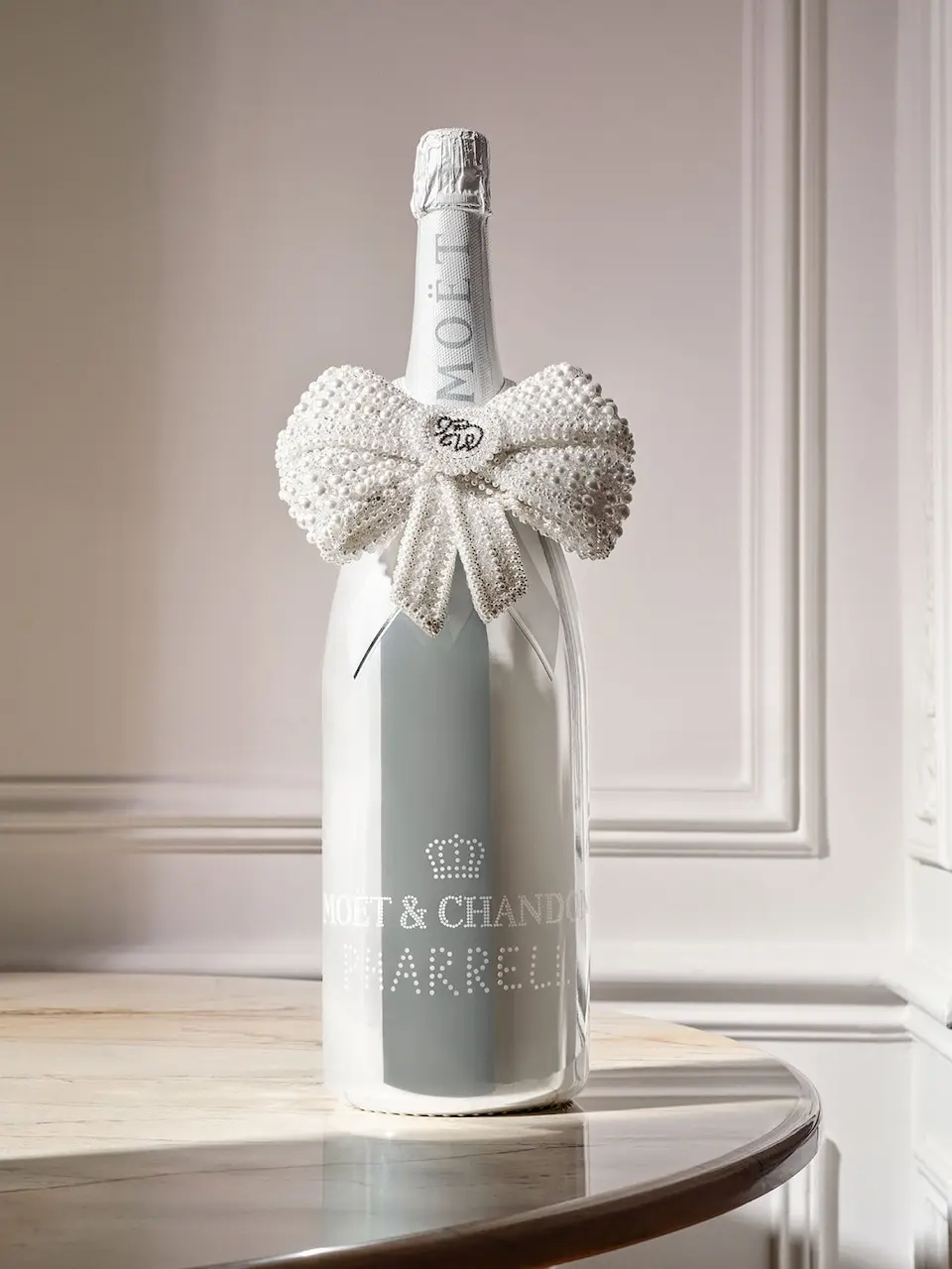 Il coffret e il collo dello Champagne più emblematico di Moët & Chandon, il Brut Impérial, si vestono d’oro, blu notte e rosso intenso, e anche di bianco per il Nectar Impérial Rosé. Pharrell firma le sue creazioni con scritte bianche formate da puntini simili a perle, sia sul coffret che direttamente sul vetro. Il sigillo reale rosso, inoltre, diventa un monogramma perlato con le iniziali del cantante, PW, intrecciate e rotonde.