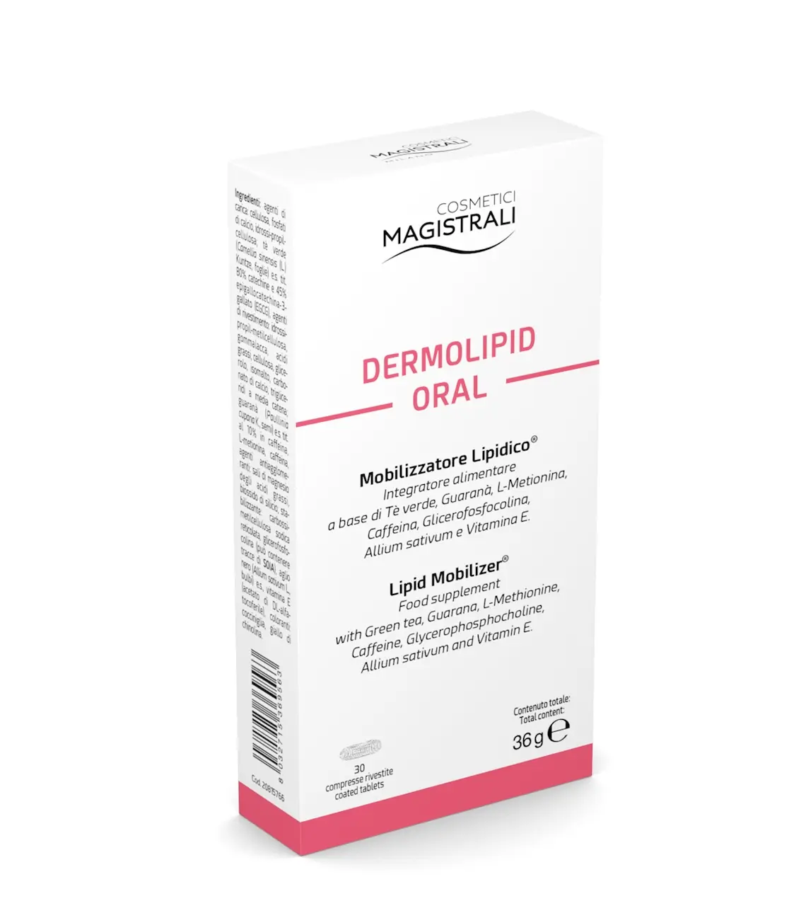 Dermolipid Oral è un integratore alimentare che formulato con Tè verde, che favorisce il drenaggio dei liquidi corporei, Vitamina E e Aglio Nero, con un’azione antiossidante, e Guaranà, che favorisce lo stimolo del metabolismo dei lipidi e contribuisce all’equilibrio del peso corporeo.