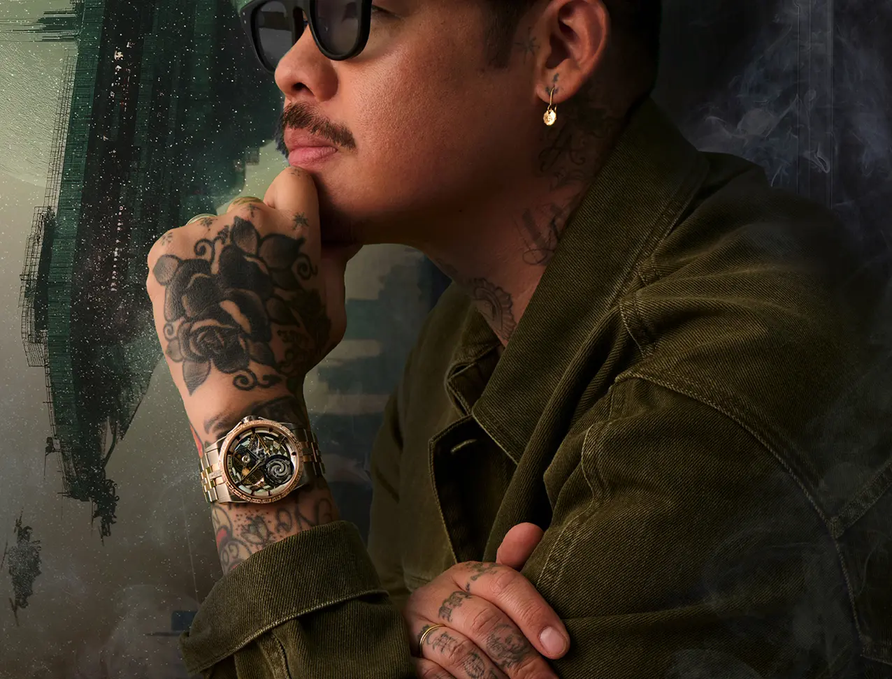 L’originale collaborazione tra Roger Dubuis e Dr.Woo è iniziata nel 2021. In un viaggio filosofico nello spazio, il tatuatore ha trasferito il proprio tratto distintivo sulle superfici dell’Excalibur Monotourbillon, veicolando il messaggio che “il tempo è il nostro bene più prezioso”.
