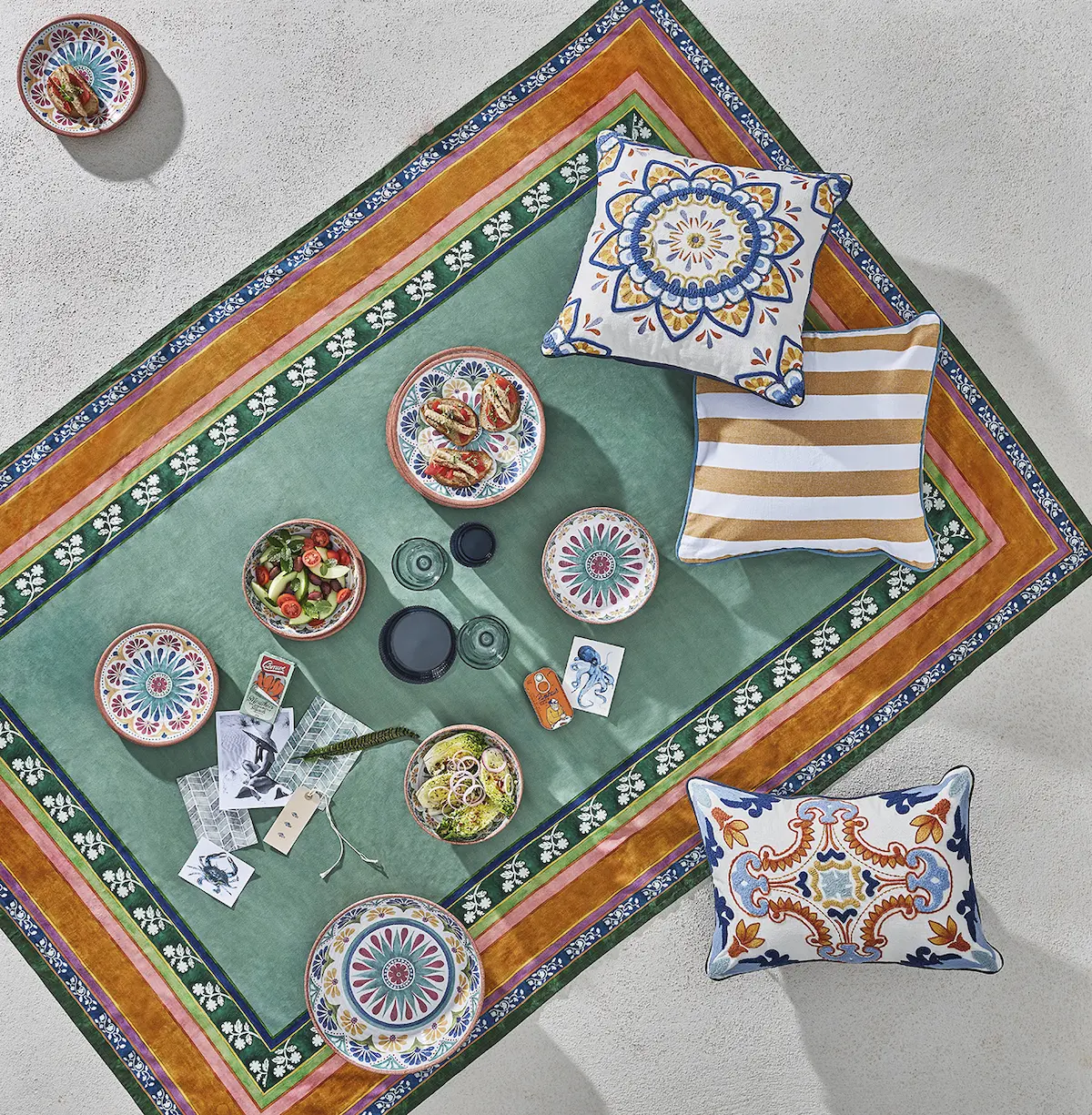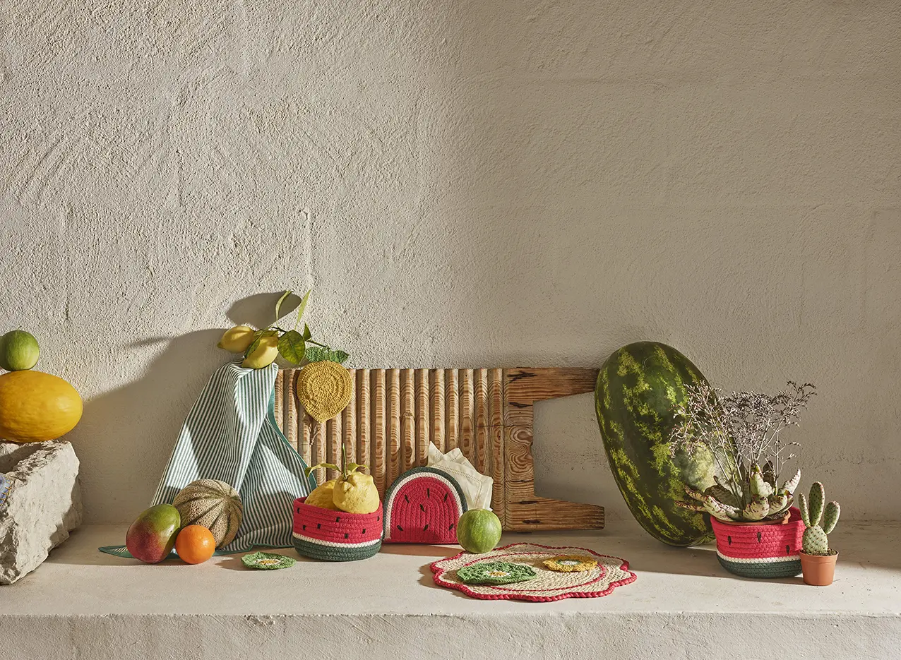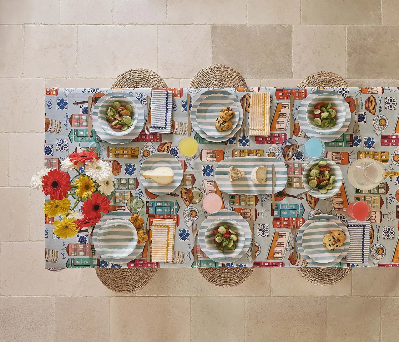 Il food gioca un ruolo centrale, trasformando in oggetti decorativi e idee regalo le famose sardine in scatola, simboli della tradizione locale, e altre delizie grafiche che richiamano la vivacità dei mercati e il piacere della convivialità. Non mancano i richiami al mondo dei pescatori, spunti per un’affascinante narrazione visiva. La tavola si anima di silhouette a colori pastello, piatti sagomati e disegni di acciughe, mentre i servizi di piatti in melamina – materiale leggero e resistente, perfetto per l’outdoor – sono decorati con motivi che richiamano le ceramiche fatte a mano. Le tovaglie si fanno giocose, abbinate a strofinacci, runner e tovagliette che esaltano il tema marino. Il richiamo arriva anche sui cuscini, vestiti di stelle marine e conchiglie. Completano la collezione vivaci accenti pop: disegni folk, cuori decorativi e originali ventagli artigianali proposti nelle fantasie piastrelle, tropicale e corallo, con montatura in legno e cordino colorato.