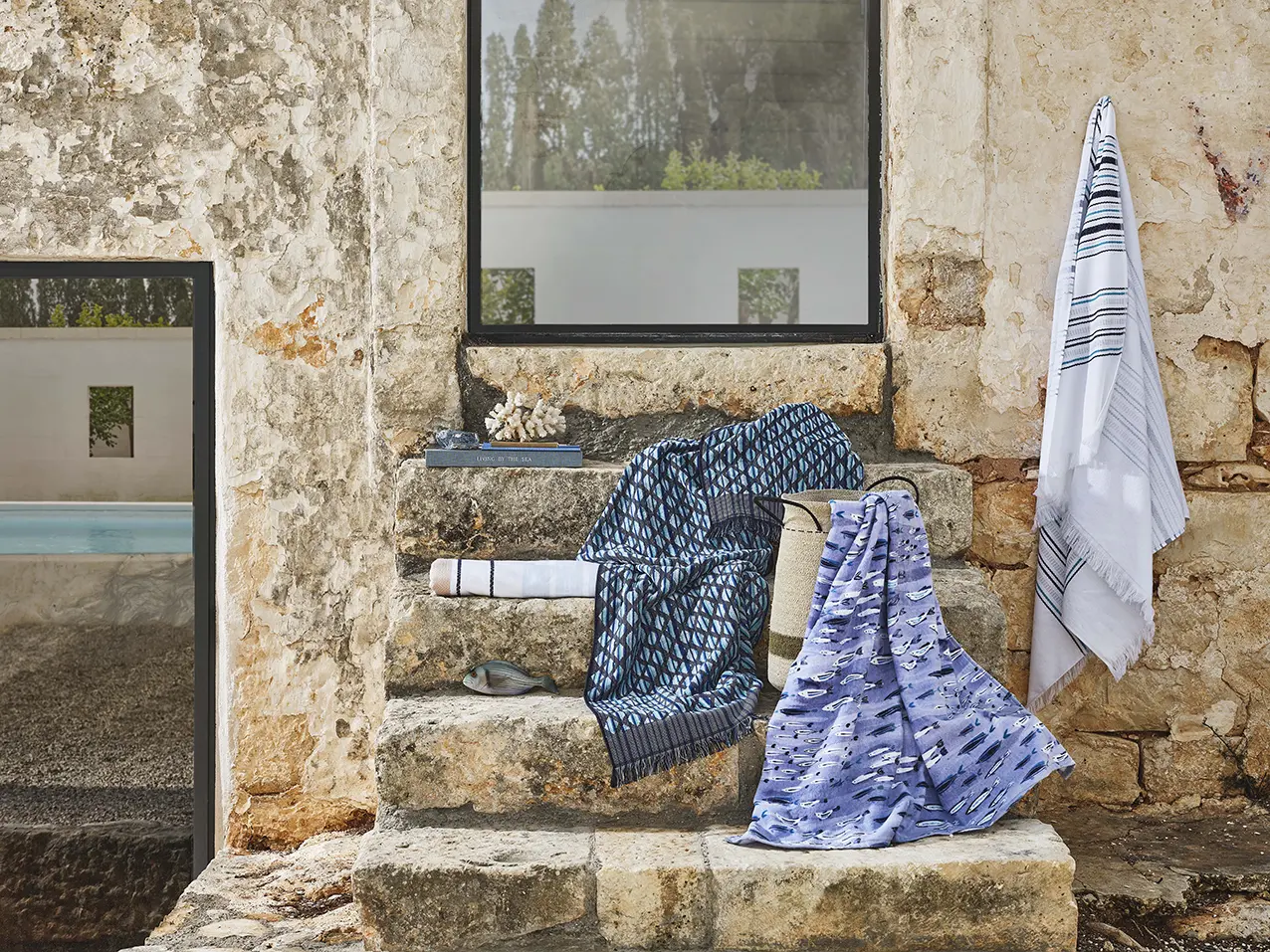 Ecco gli azulejos, le celebri piastrelle lusitane, reinterpretate attraverso pattern acquerellati, geometrie ingrandite e tonalità luminose: prendono forma in eleganti set di biancheria letto, cuscini decorativi che giocano con tinte unite e righe, teli mare jacquard e velour da portare in spiaggia. Dal mare si passa a elementi urbani dal forte impatto visivo: facciate decorate, tram storici, dettagli architettonici e geometrie che disegnano le piazze di Lisbona, Sintra, Porto.