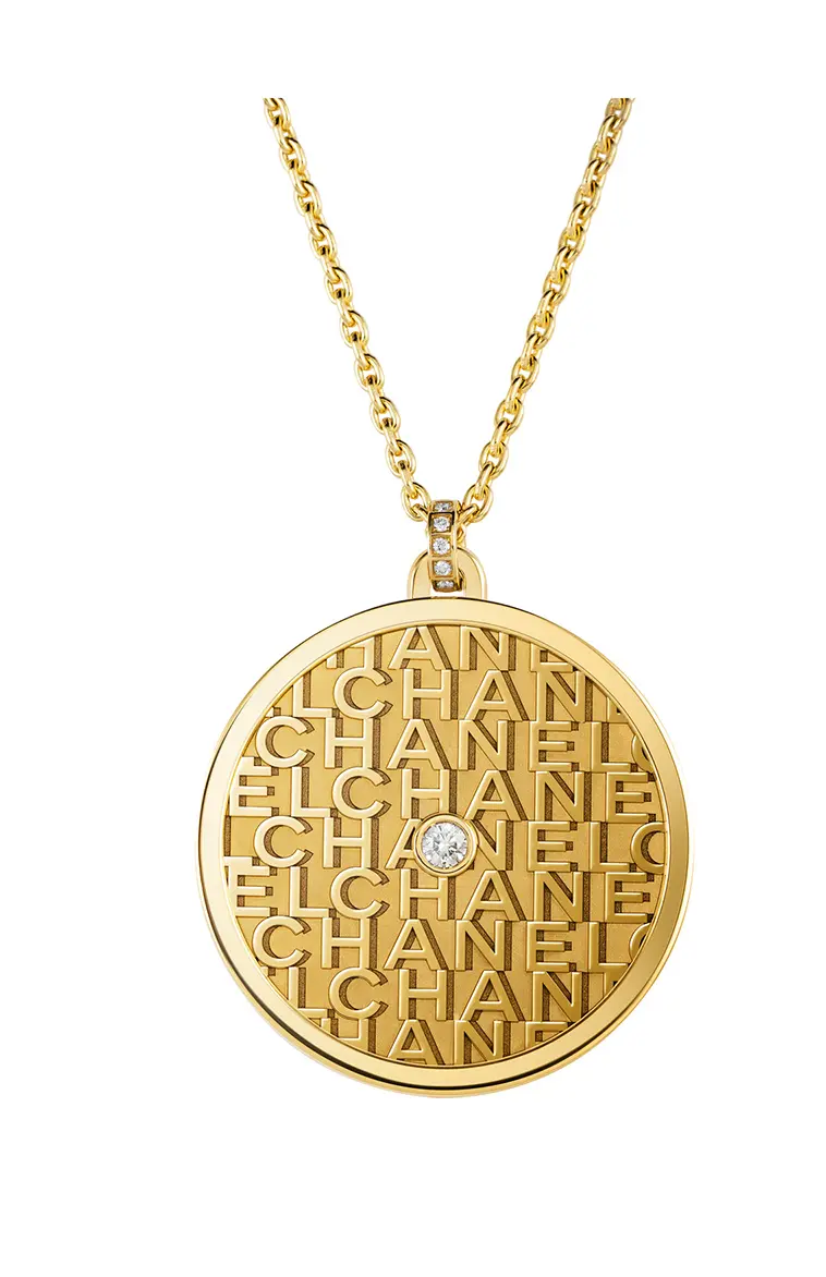 Per valorizzare questi simboli trionfali, intimi e universali al tempo stesso, il Jewelry Creation Studio offre loro una montatura squisitamente sobria: una placca di giada nera incorniciata da linee dorate e ornata da 74 diamanti. Questa pietra naturale non trattata, con il suo nero profondo e intenso, esalta la finezza dei quattro motivi in oro lucidati a specchio. Al centro, un diamante da 0,21 carati illumina l’insieme. Sul retro del gioiello, un bassorilievo inciso al laser, tecnica mutuata dall’orologeria, ripete all’infinito la scritta “CHANEL”, conferendo forza e ritmo a questa composizione con un diamante da 0,10 carati al centro. La chiusura scorrevole senza moschettone consente di regolare la lunghezza della catena e termina con una targhetta incisa con la firma autografa di Gabrielle Chanel e una cometa.