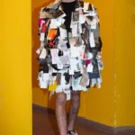 L’ironia è da sempre l’arma che il brand usa per esprimere il disappunto, e allora… le ‘sciure’ e i ‘bauscia’ milanesi, le Birkin stampate e disegnate su borse e capi, la giacca di Chanel fatta con la vernice spray, i foulard ‘tarocchi’ trocchi di Hermes in testa o sulle spalle o addirittura trasformati in abiti, la decostruzione del cardigan beige, festoni e fiocchi da pacco regalo che fanno tanto ‘concetto Prada’, oro degli stolti un po’ dappertutto, per arrivare al finale dove il vestito viene addirittura cancellato da circa cinquecento cartellini di altri brand.