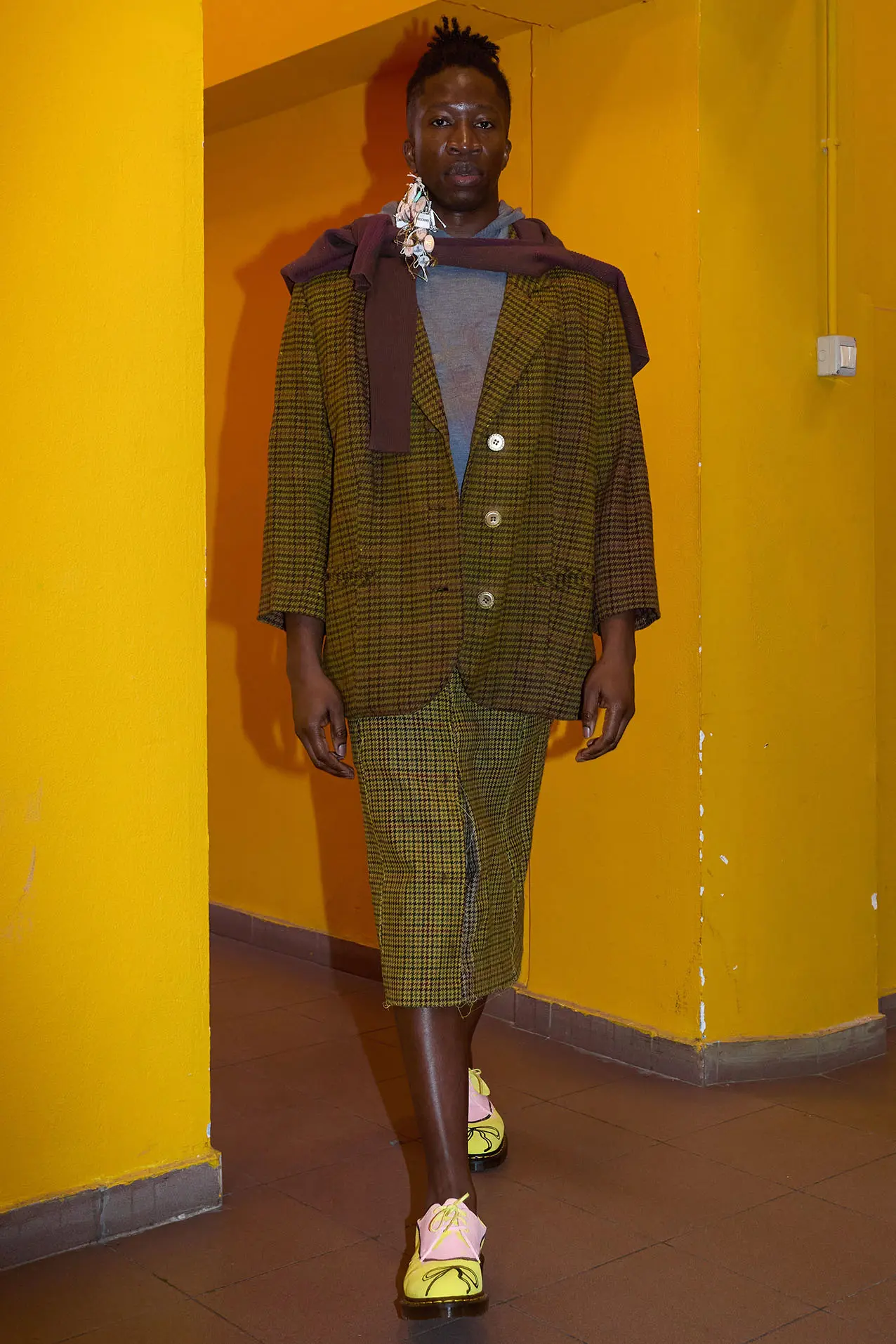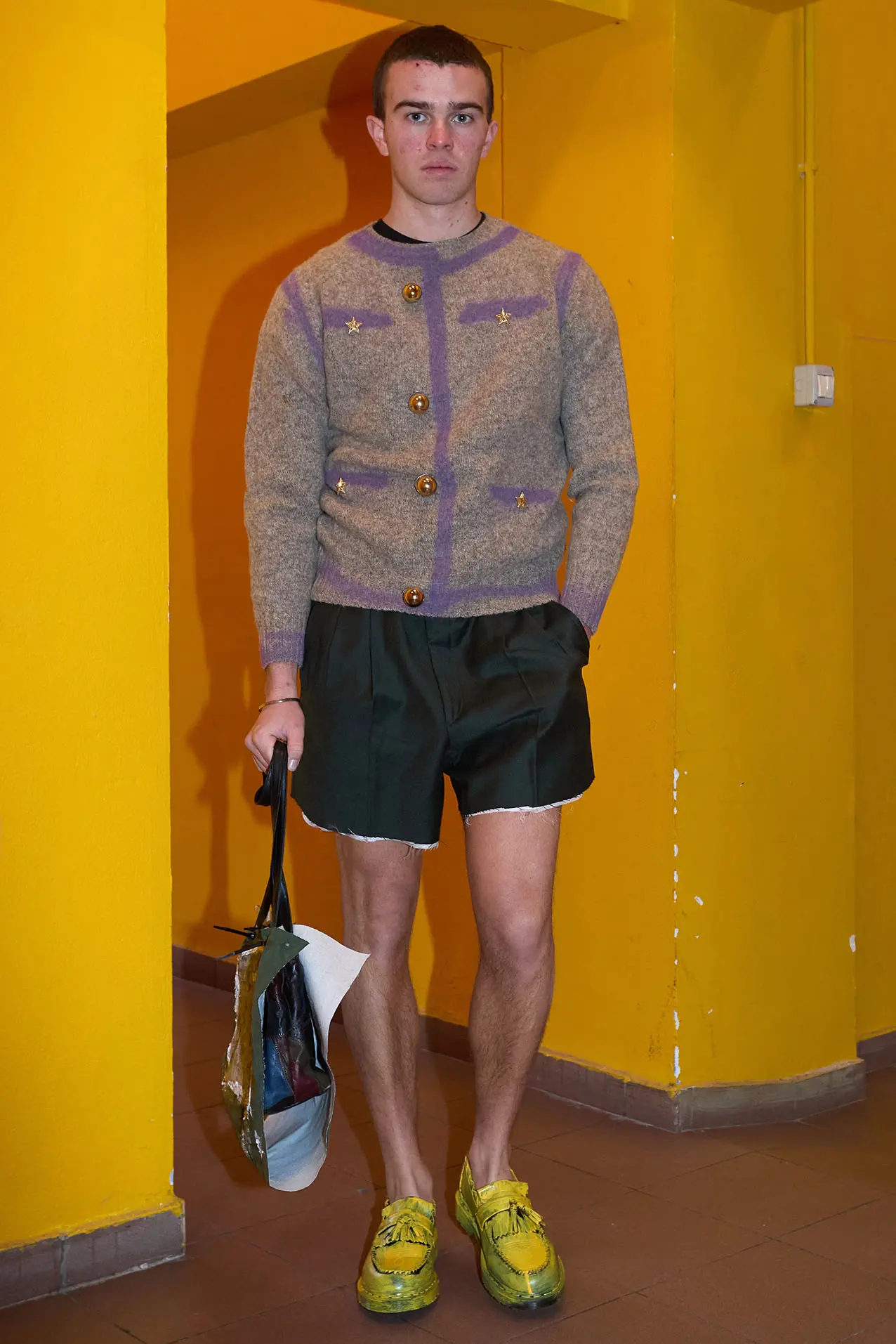 La palette è ispirata ai ‘Quality Street’, i tradizionali cioccolatini delle nonne inglesi, e le tecniche di lavorazione sono il vero legame con le collezioni precedenti: i nodi, i capi patchwork tenuti insieme da fascette industriali e una continua sperimentazione sulle diverse tecniche di tintura. Anche questa stagione il brand ha collaborato con Dr. Martens, customizzando il loro deadstock, trasformando le scarpe ‘streetwear’ in ballerine Chanel. A guidare nell’approccio all’assemblaggio di questa collezione sono stati Miuccia Prada, Yves Saint Laurent ma soprattutto e più di tutti Franco Moschino, inarrivabili eroi della borghesia.