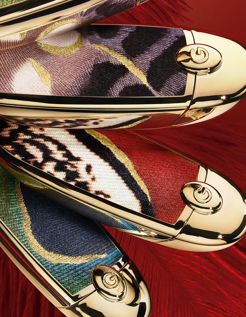 Il packaging dorato, come la cover Rouge G, presenta la stampa color rosso intenso e beige delicato, ispirata alle maestose piume della Fenice.
