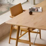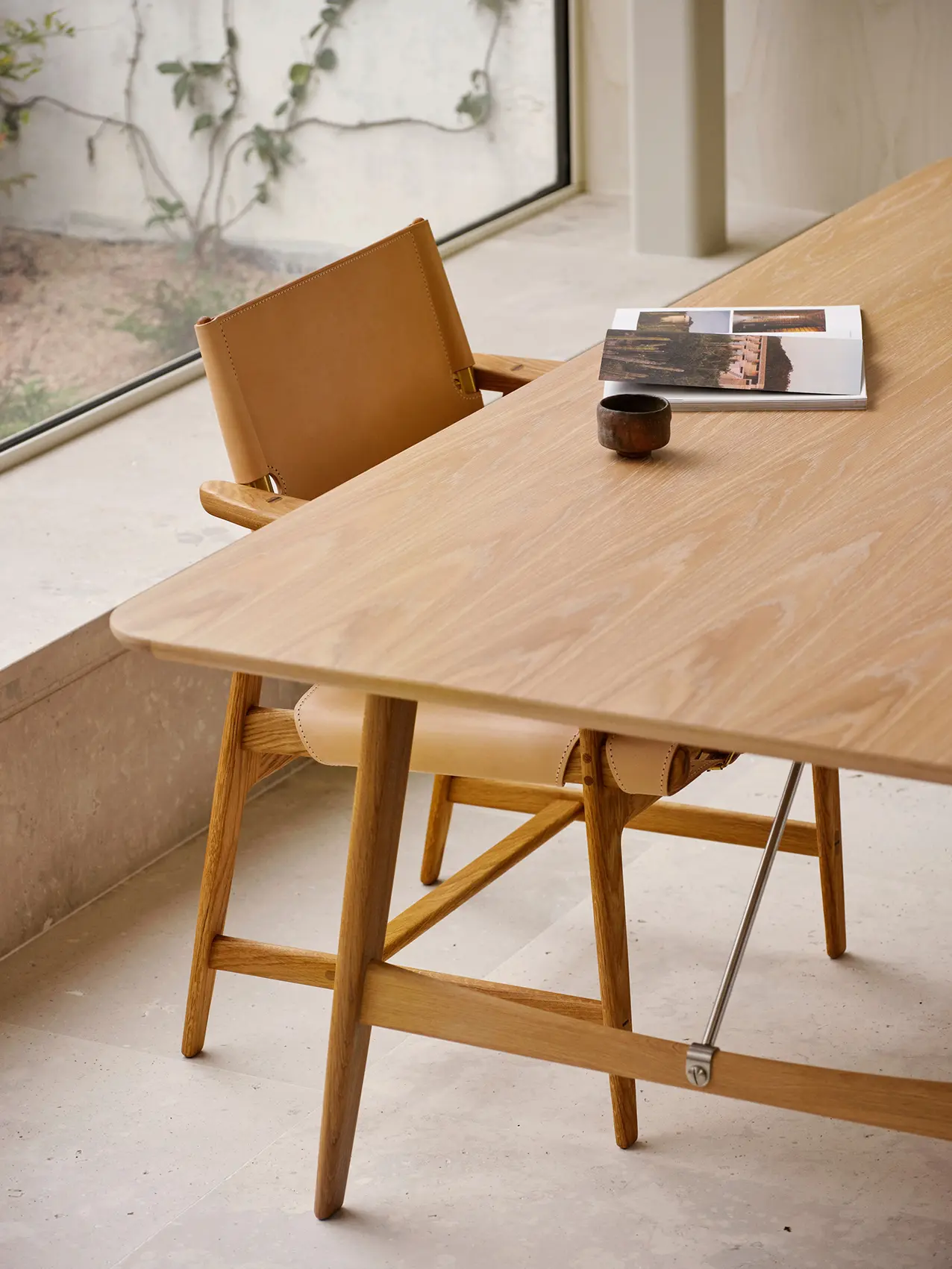 Il design strutturale dell’Hunting Table include due cavalletti in legno massello con gambe ad angolo che sostengono un piano sottile impiallacciato con spigoli arrotondati e bordi a loro volta in legno massello. La stabilità si ottiene montando due barre trasversali (in ottone o in acciaio inox) tra i cavalletti e il piano del tavolo: un tocco funzionale che migliora l’estetica del tavolo. Un altro dettaglio raffinato è costituito dal giunto a tenone tra le gambe del tavolo, fissato con cunei in legno a contrasto, levigato meticolosamente a mano e rifinito dagli abili artigiani di Carl Hansen & Søn.