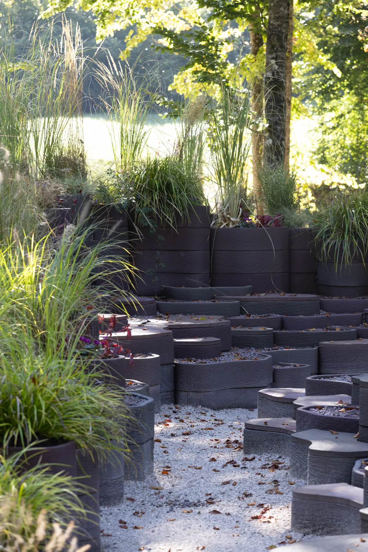 L’installazione è composta da 415 blocchi stampati in 3D – 58 tipologie modulari che ricordano colonne basaltiche: forme irregolari, talvolta cave, talvolta piene che formano sedute o tasche di terra per piccole essenze arboree autoctone. La varietà tipologica consente a ogni modulo di auto-incastrarsi, generando una struttura autoportante, priva di malte o leganti, fedele alla tradizione costruttiva a secco ma reinterpretato in modo contemporaneo grazie a supporti digitali all’avanguardia.