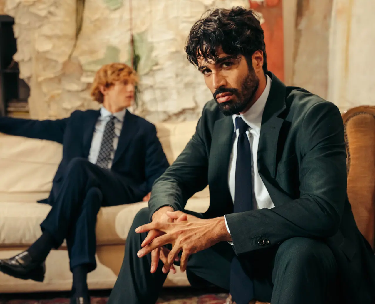 La palette cromatica evoca una stagione intensa e avvolgente: blu intensi e marroni profondi dialogano con tonalità beige e neutre, illuminate da contrasti che ricordano i giochi di ombre e luci di un quadro. Ogni capo è pensato per unire comfort e rigore, libertà e struttura, spontaneità e raffinatezza.
