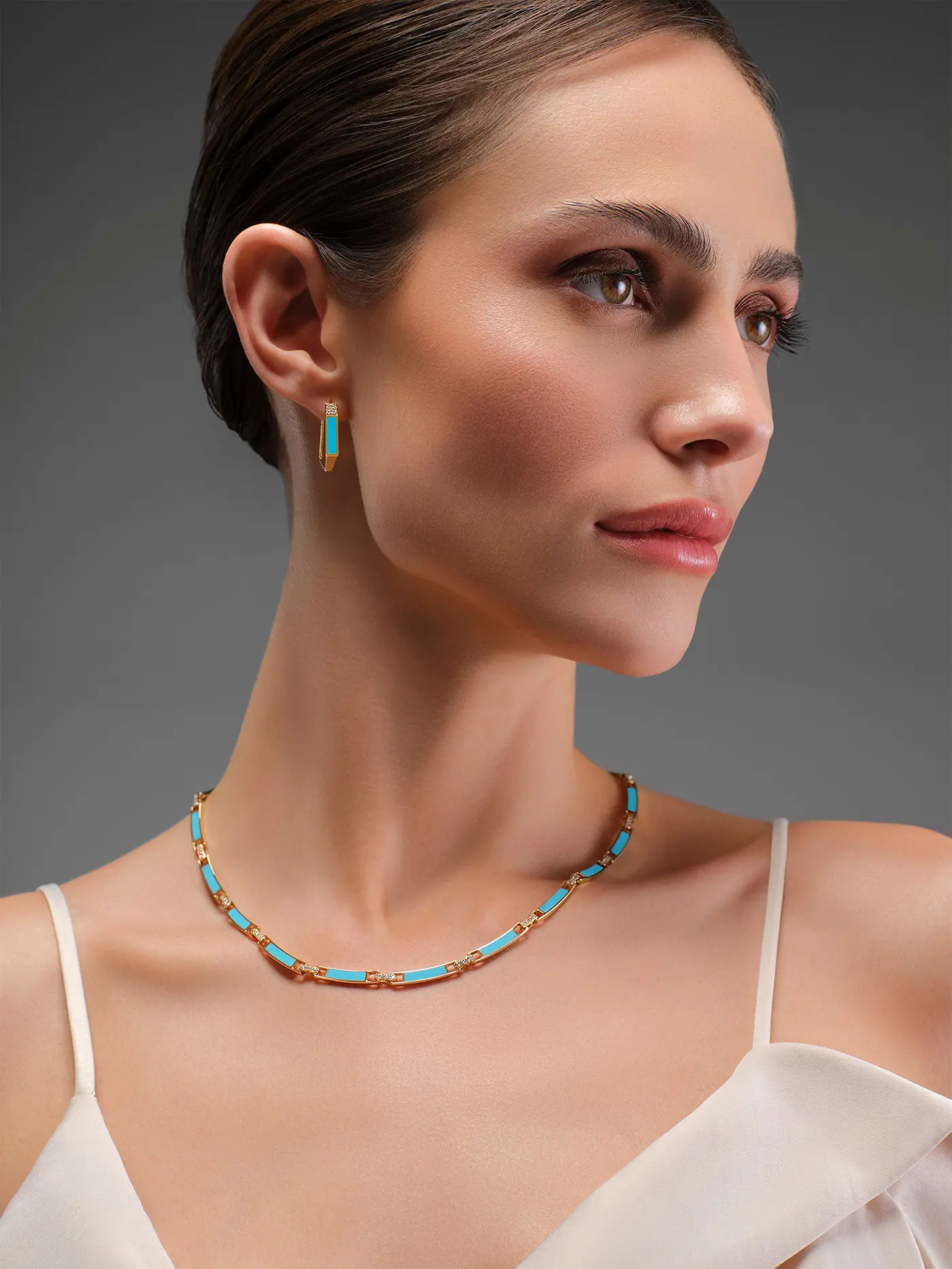 Protagonista della collezione è un elemento centrale, una placchetta d’oro rettangolare all’interno del quale sono incastonate le pietre preziose che si combinano ai diamanti in montatura pavè. La collezione, caratterizzata da una linea continua che rappresenta simbolicamente l’individualità e la scelta di sentirci unici, propone parure completa e diversi modelli che si adattano a ogni gusto o esigenza. Le linee classiche si fondono ad elementi contemporanei e i colori delle pietre, uniti alla luminosità del diamante e al calore dell’oro 18 carati, creano effetti di luce che impreziosiscono i gioielli che arricchiscono con delicatezza ogni look.