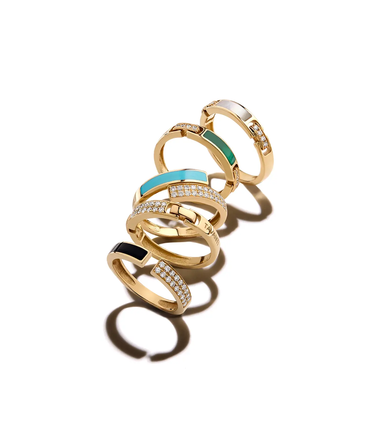 La placchetta d’oro, elemento chiave della collezione, è esaltata dal contrasto dei colori delle pietre preziose che si uniscono ai diamanti, dalla lucentezza del turchese, all’intensità del verde malachite, dall’energia dell’onice alla calma rassicurante della madreperla. Gli anelli sono disponibili nella versione aperta, contrariè e a doppia banda; le estremità dell’anello che si incontrano sembrano sfiorarsi in un gioco di contrasti tra la brillantezza dei diamanti e l’intensità delle pietre.