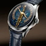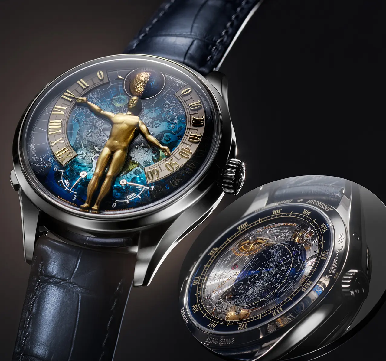 Valorizzata da una combinazione di mestieri d’arte tradizionali e tecniche decorative moderne, la figura si erge su uno sfondo che rappresenta le costellazioni così come potevano essere osservate da Ginevra il giorno della fondazione della Maison nel 1755. Essa è abbinata a una doppia indicazione retrograda della riserva di carica e fasi lunari tridimensionali di precisione con indicazione dell’età della luna. Il quadrante sul retro presenta una carta celeste che visualizza il giorno siderale e segue in tempo reale lo spostamento delle costellazioni, con una precisione che prevede una sola giornata di scarto in 9.130 anni. Concepito come omaggio all’orologio astronomico La Quête du Temps, creato per il 270° anniversario, il Métiers d’Art – Tributo alla Ricerca del Tempo è presentato in una cassa in oro bianco da 43 mm e in edizione limitata di 20 esemplari. Con la sua estetica distintiva e la sua meccanica innovativa, il modello Métiers d’Art – Tributo alla Ricerca del Tempo esprime in modo eloquente la visione di Vacheron Constantin nell’arte orologiera: valorizzare le innovazioni del passato, reinterpretarle e fonderle con sviluppi del tutto inediti.