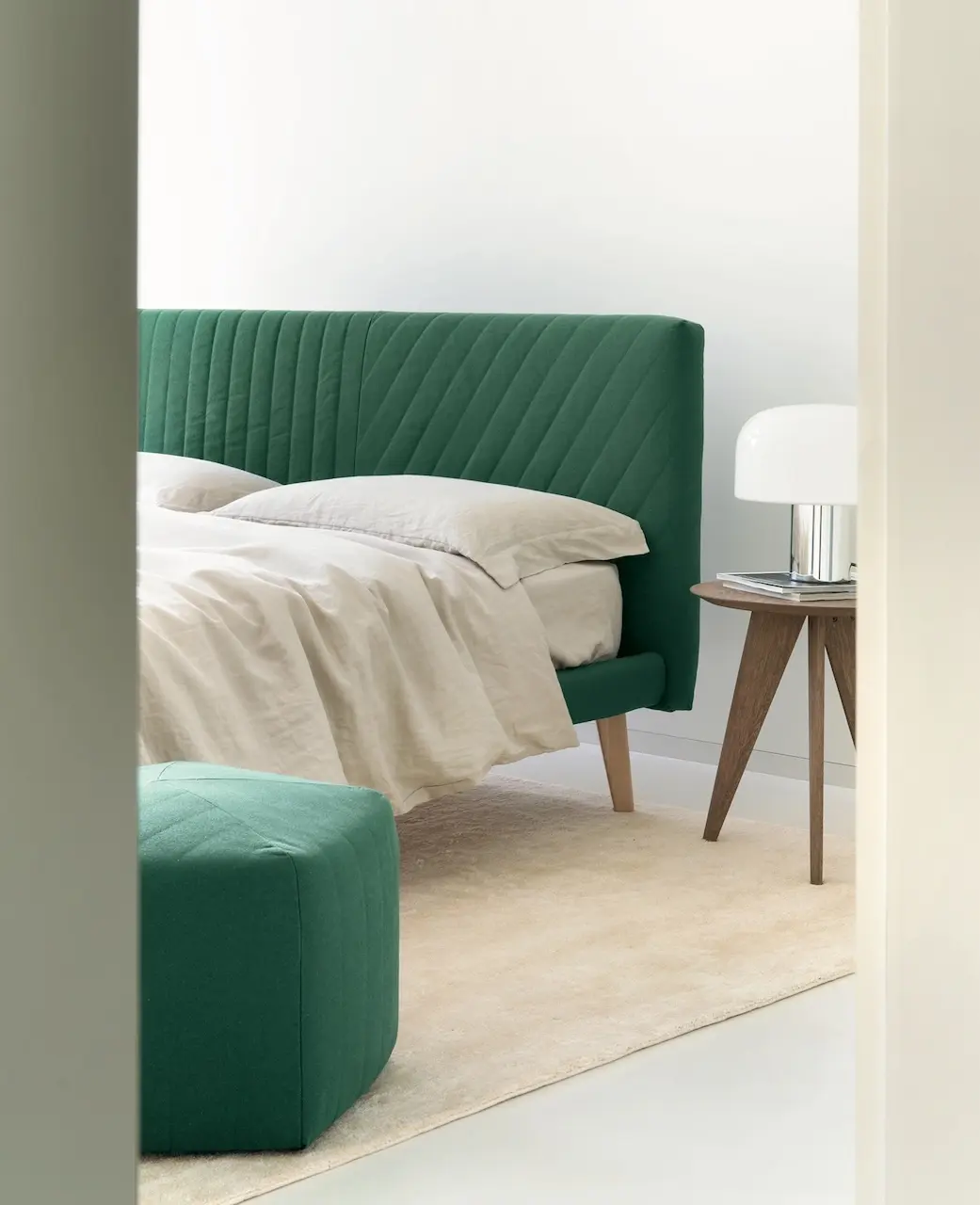 A completare il progetto contribuisce il pouf coordinato, un elemento che dialoga con il letto esaltandone l’equilibrio estetico e funzionale.