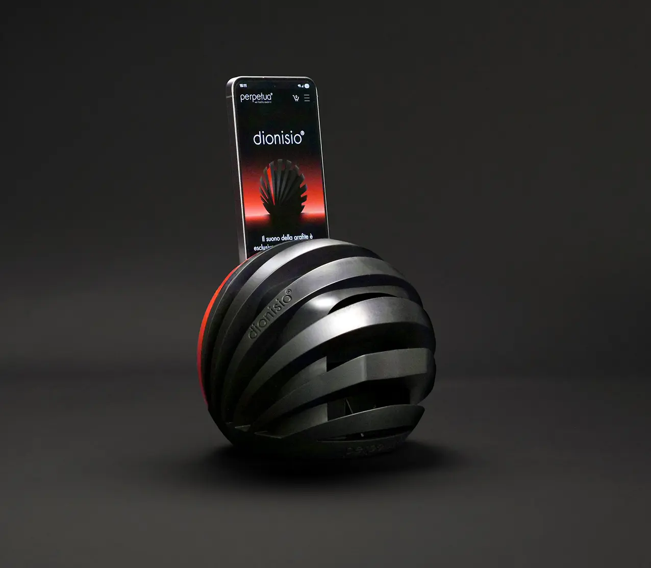 Dalla rivoluzione di Perpetua nasce dionisio®. Si tratta di un diffusore acustico per smartphone, che è insieme un oggetto di design (nato dalla creatività della designer Marta Giardini), un esempio di economia circolare (come Perpetua, anche dionisio è composto all’80% di grafite riciclata, a cui viene aggiunto un eccipiente minerale) e un modello di alta tecnologia.