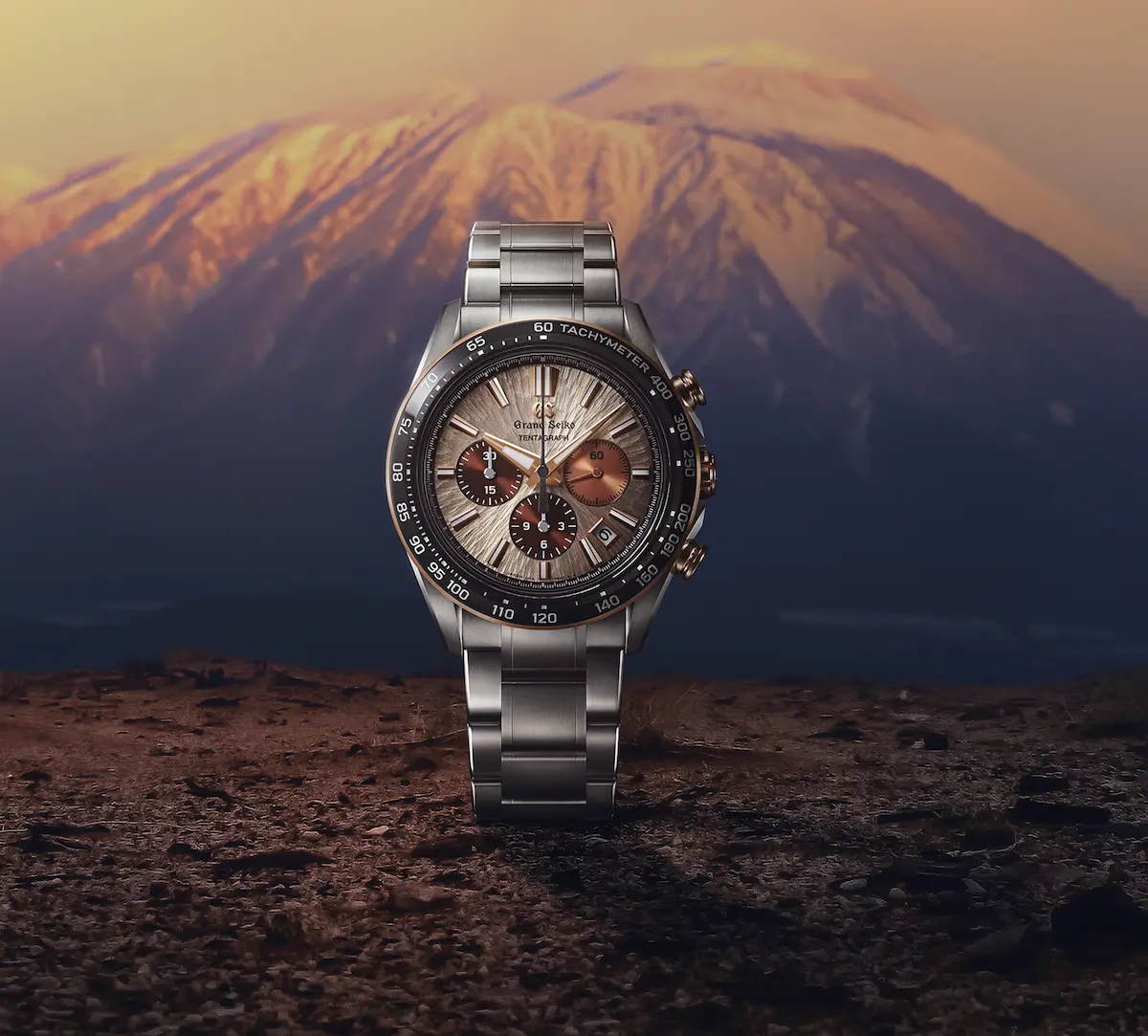 La Evolution 9 Collection è stata la prima ad accogliere il cronografo meccanico di Grand Seiko, equipaggiato con il calibro 9SC5 Tentagraph. In omaggio alla natura che circonda la sede del brand a Shizukuishi, Grand Seiko presenta una nuova creazione alimentata da questo prestigioso calibro, che eleva la fusione tra lo spirito del marchio e l’estetica giapponese, combinando l’eleganza di un quadrante strutturato in una raffinata tonalità tra il rosa e il rame, con i dettagli in oro rosa della cassa, che evocano la luce dell’alba sul Monte Iwate.