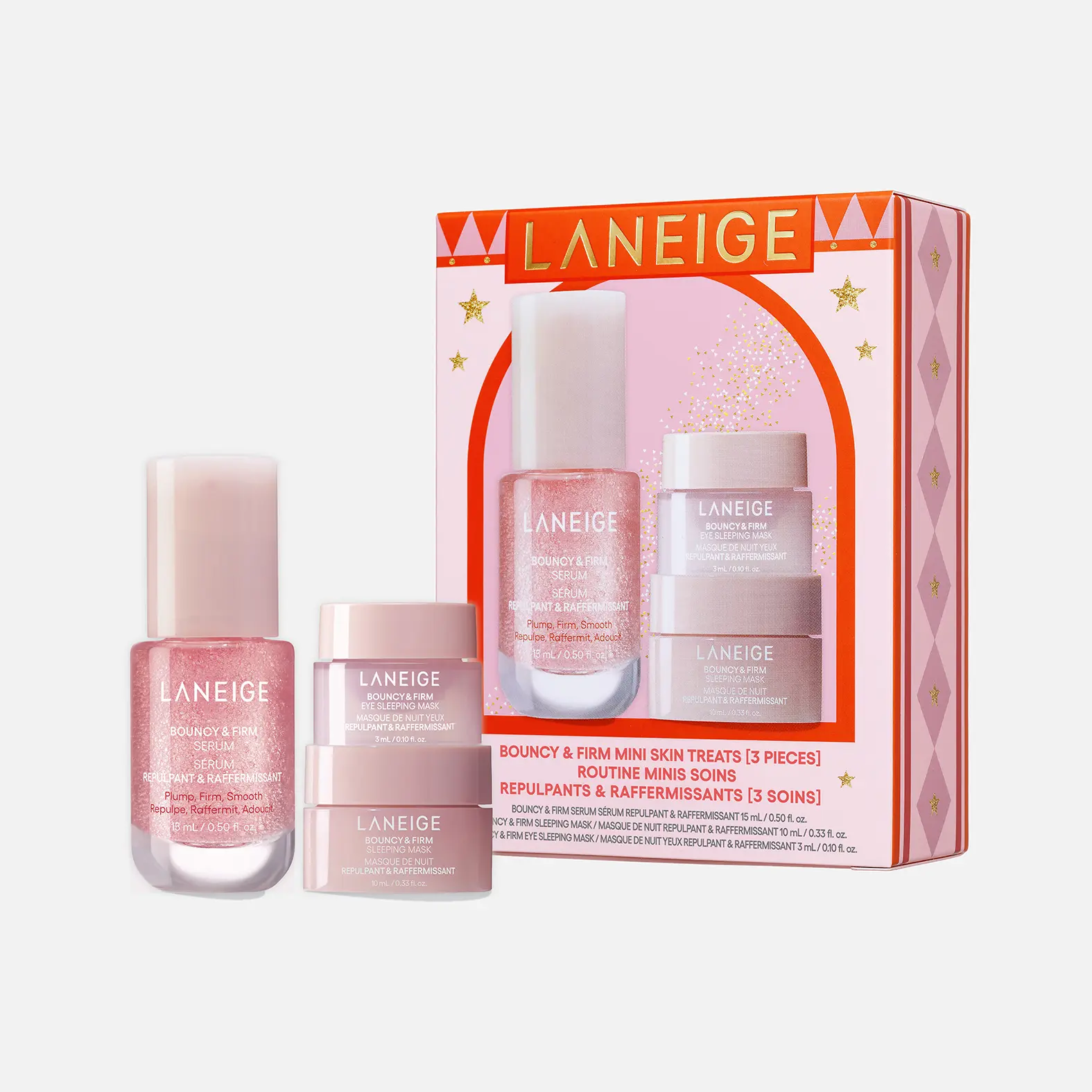 Il Set Bouncy & Firm Mini Skin Treats riunisce 3 elementi essenziali Bouncy & Firm per una pelle intensamente idratata, rassodata e luminosa: Siero Bouncy & Firm: un siero leggero al collagene e ai peptidi che idrata, leviga e rimpolpa la pelle, mentre la rassoda; Bouncy & Firm Sleeping Mask – Maschera Notte: una maschera da notte che aumenta l’idratazione e la compattezza della pelle durante il sonno, per un incarnato luminoso al risveglio;