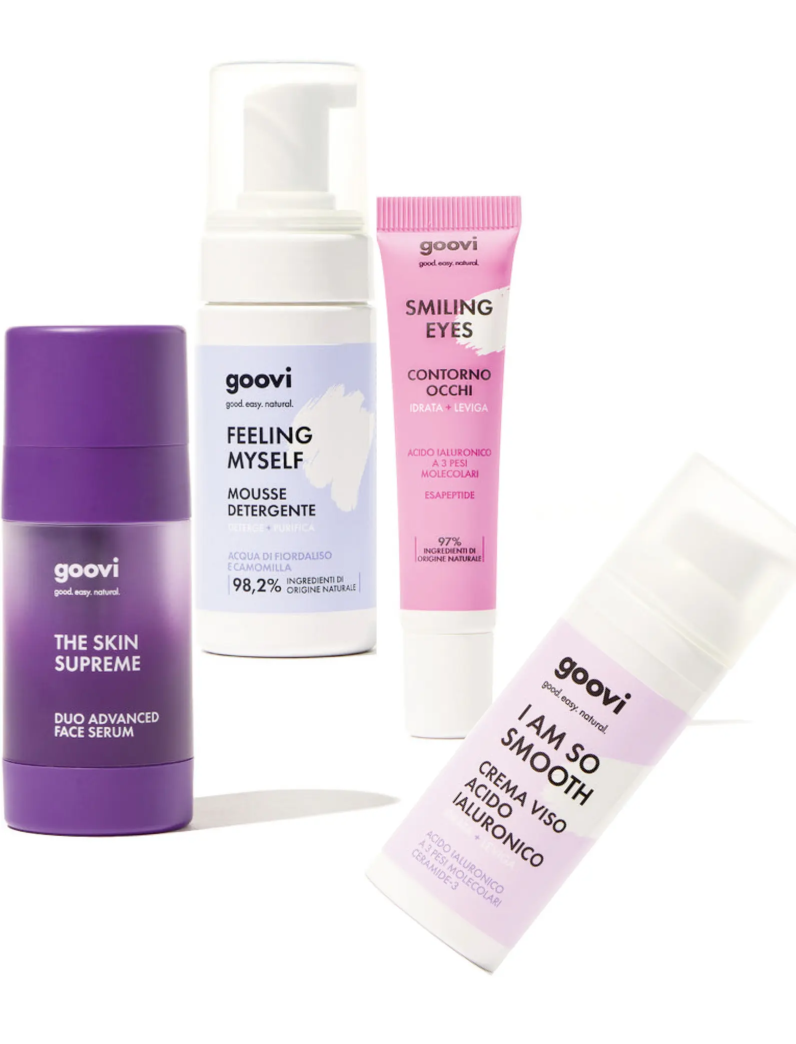 Con i trattamenti adeguati è possibile ripristinare equilibrio, morbidezza e luminosità, restituendo alla pelle tutto il suo comfort anche nelle giornate più fredde. Infatti, scegliere formule che nutrono in profondità e rinforzano la barriera cutanea è il primo passo per affrontare la stagione con una pelle sana e radiosa. Per questo goovi ha pensato a una routine completa e semplice da seguire, studiata per mantenere la pelle morbida, elastica e luminosa anche nei mesi più freddi. Quattro step essenziali, dalla detersione all’idratazione, che lavorano in sinergia per offrire un’azione completa e a 360°.