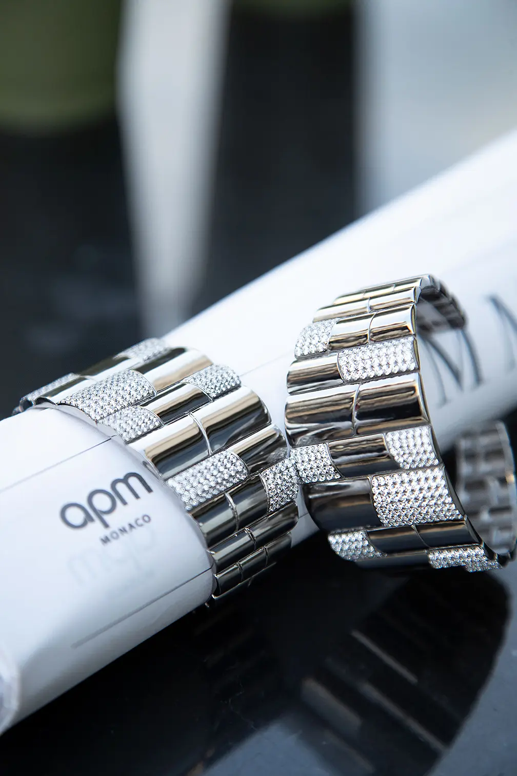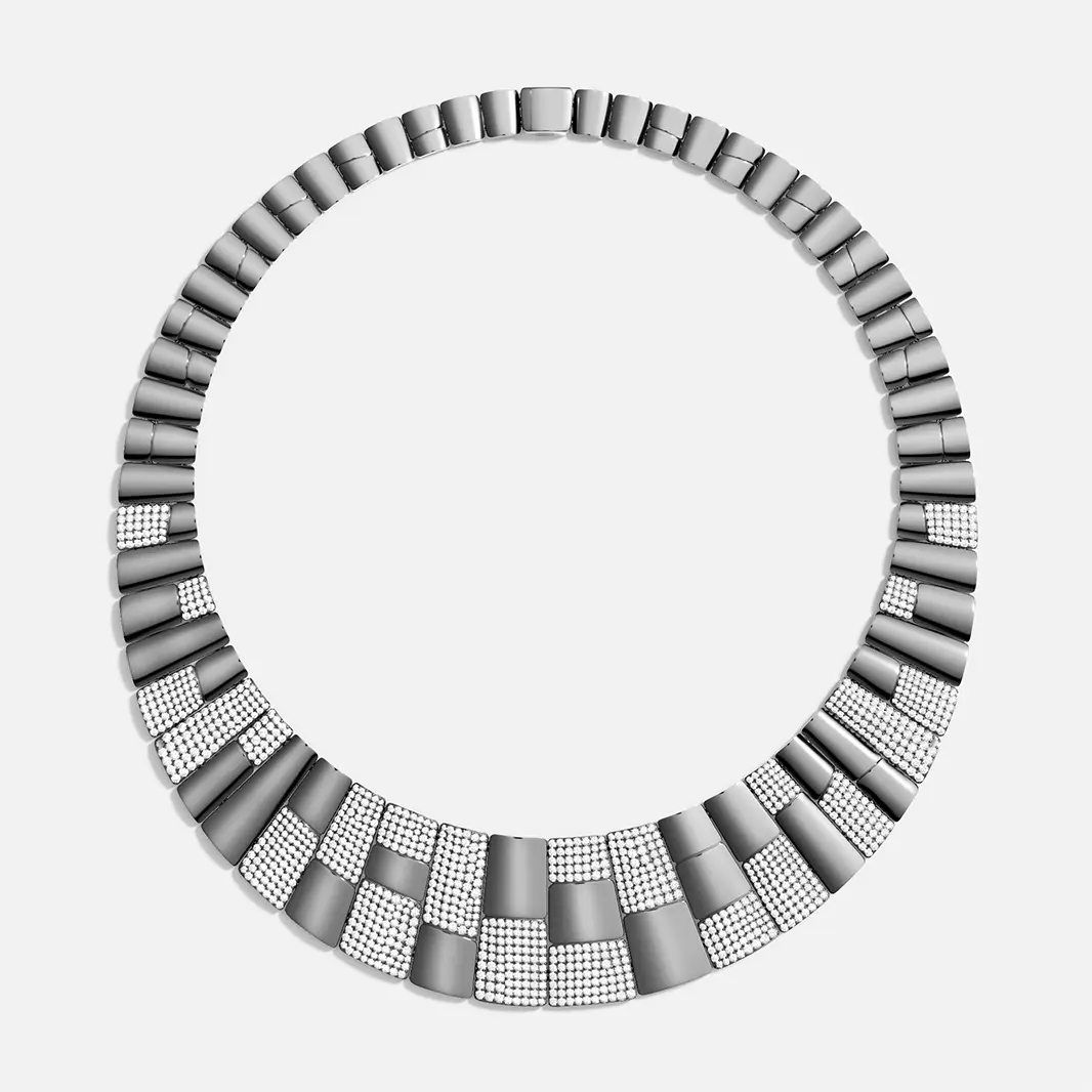Questa particolare lavorazione, realizzata interamente a mano negli atelier APM Monaco, crea un gioco di luci e ombre che dona profondità e movimento a ogni pezzo, rendendolo perfetto sia per occasioni formali che per l’uso quotidiano.