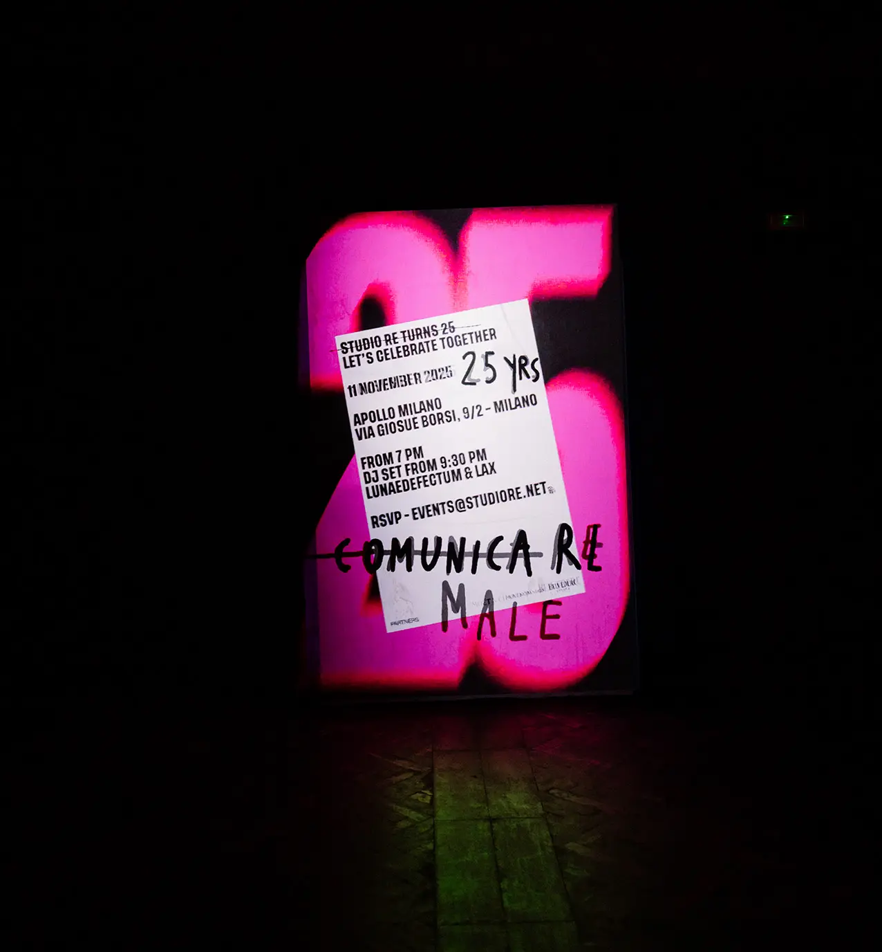 Durante la serata, il visual e tattoo artist Tatuaggi Male ha proiettato live una serie di pensieri ironici e provocatori sul mondo della comunicazione, invitando gli ospiti a condividere la propria visione di Studio Re. Ne è nato un mosaico collettivo di parole, emozioni e ricordi: un ritratto spontaneo e corale dell’impatto dell’agenzia nel corso degli anni.