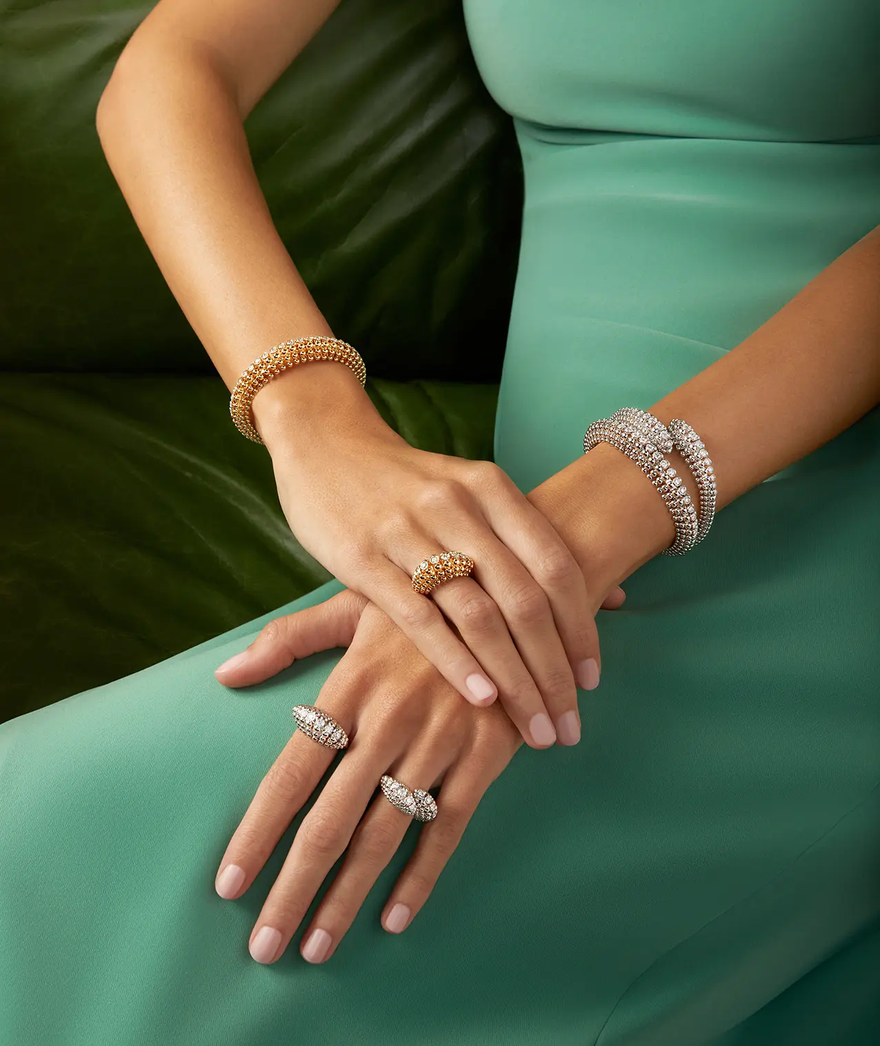 Infine, SPETTINATO evoca l’arte dell’imperfetto che diventa eleganza: petali d’oro bianco, giallo e rosa si intrecciano con diamanti e pietre preziose, celebrando la libertà creativa e la grazia naturale.