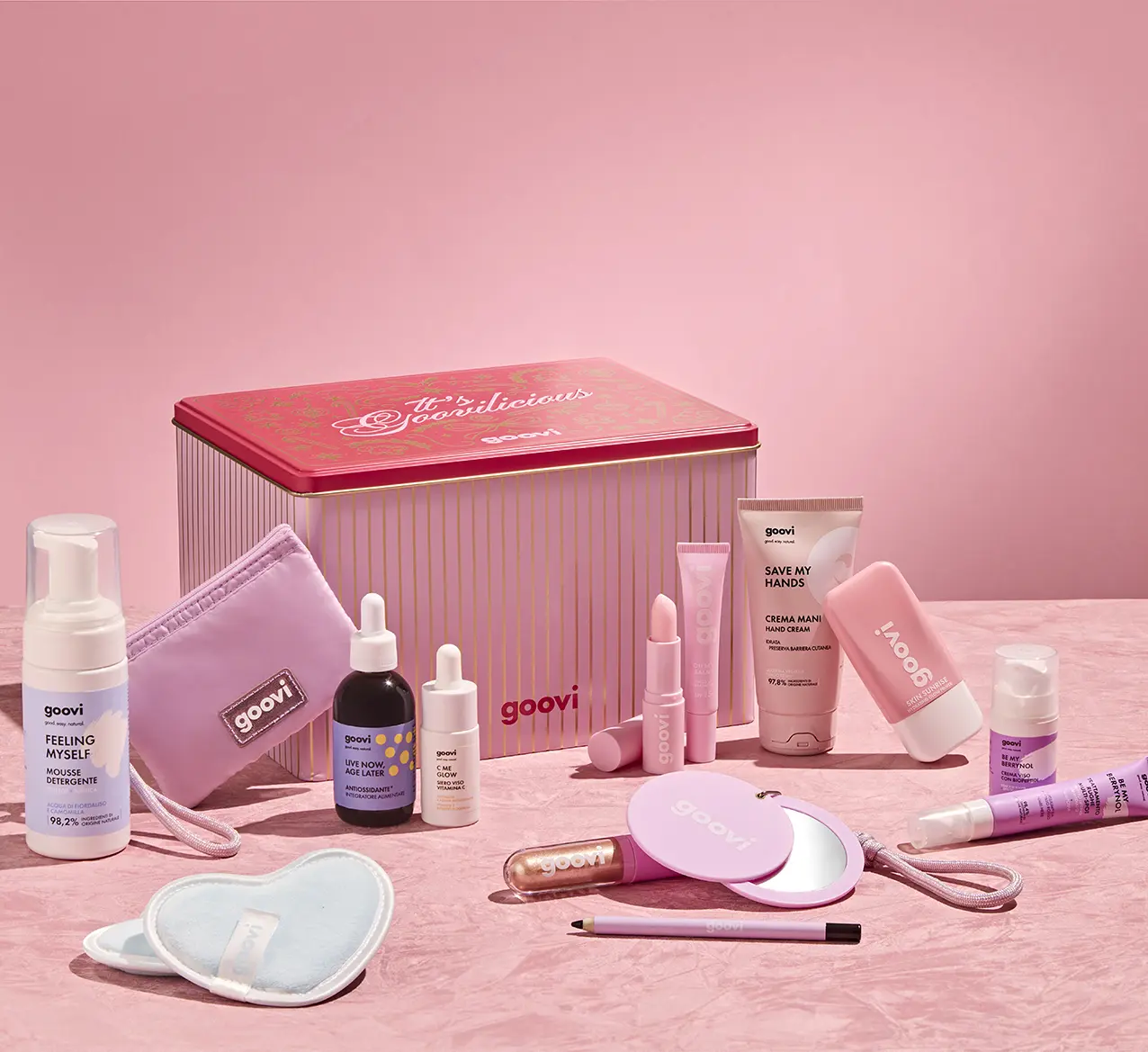 All’interno, 12 prodotti + 1 sorpresa finale, con una selezione esclusiva di prodotti goovi, tra cui 7 prodotti in formato full size, 2 prodotti in formato travel, per portarli ovunque e 4 prodotti in esclusiva, di cui una sorpresa finale per chiudere il countdown con un sorriso.