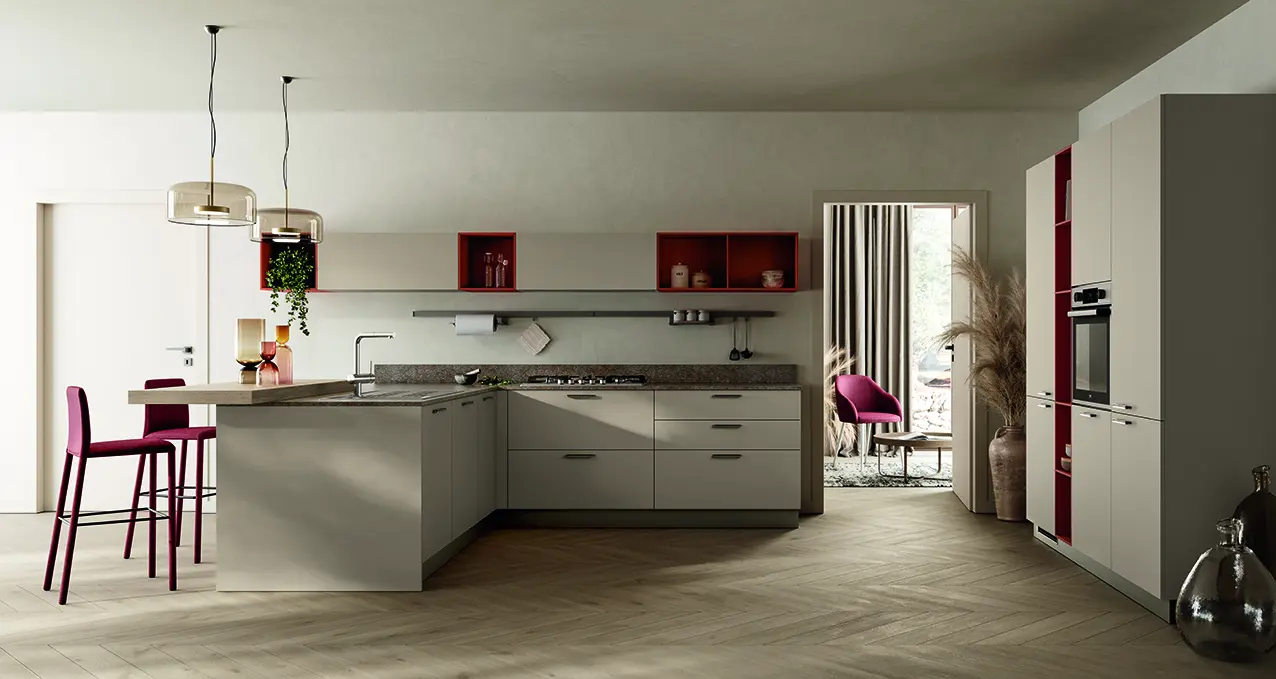 Moda offre una elevata libertà compositiva, attraverso soluzioni che variano da configurazioni minimaliste e lineari a composizioni più audaci e articolate, adattandosi perfettamente sia a contesti moderni che tradizionali. Dai layout con isola o penisola alle strutture a golfo, ogni progetto può essere arricchito da complementi aggiuntivi come le barre porta accessori Sign, gli schienali attrezzati Opus e SetUp, il sistema di boiserie Line System e i sistemi Parete “Fluida” e Status. Ogni elemento è concepito per ottimizzare lo spazio a disposizione, rispondendo alle necessità del vivere contemporaneo e riflettendo appieno il gusto e la personalità di chi lo abita.