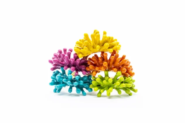 • Corallo anelli e orecchini di tutti i colori diventano una garbata e dolente denuncia del grave danno che lo stress termico provoca al nostro mare (sbiancamento della barriera corallina).