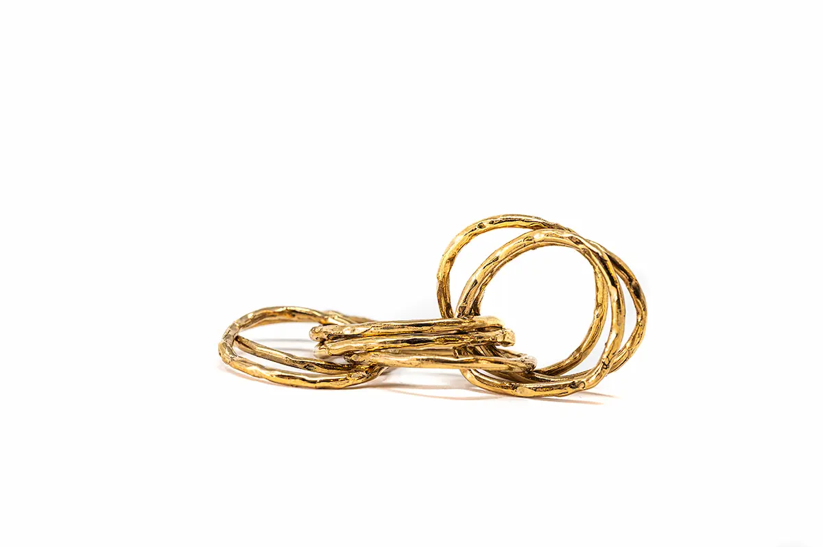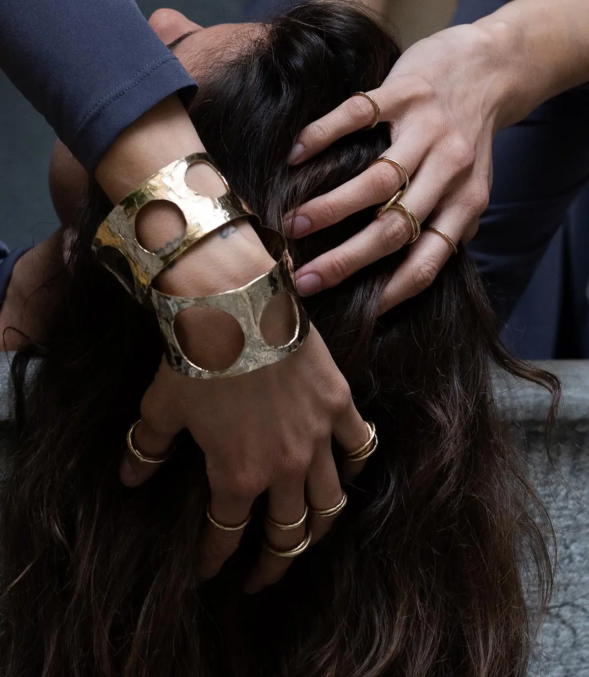 • Pantarei, dal greco “tutto scorre”, il metallo si fa flusso. Argento e bronzo si modellano in linee essenziali, materiche, liquide. Choker, bracciali e anelli raccontano la libertà del movimento e la bellezza dell’impermanenza, in una visione unica e inclusiva.
