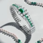 Tutte le pietre colorate sono certificate SSEF dalla Swiss Foundation for the Research of Gemstones. Sull’orologio, attorno al quadrante completamente rivestito di diamanti, due pietre taglio smeraldo della stessa tonalità cromatica si stagliano sullo scintillio glaciale di dieci diamanti taglio smeraldo. L’orologio e il gioiello sono entrambi progettati per integrarsi perfettamente sia con il bracciale sia con il sautoir, lungo 85 cm, che unisce la forma rotonda di 112 perle Akoya – selezionate per la loro lucentezza profonda e brillantezza – a boule di pietre preziose e ornamentali lucide. La collana lunga termina con una nappina di perle sormontata dalla boule lucida della pietra preziosa.