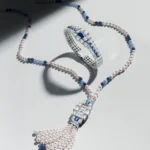 Il Grand Lady Kalla – Zaffiro è realizzato in oro bianco e presenta un totale di circa 49,72 carati di zaffiri: otto zaffiri taglio smeraldo sul bracciale, due sull’orologio e due sul gioiello, oltre a uno zaffiro taglio sugarloaf di circa 2,54 carati. Sul sautoir, 31 boule lucide di zaffiro blu sono accompagnate dal delicato bagliore di 112 perle Akoya e 20 boule lucide di calcedonio blu.