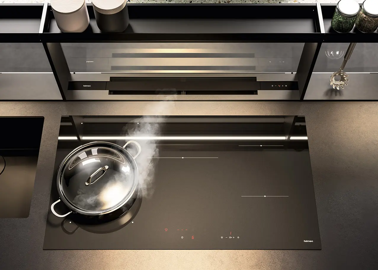 Realizzata in alluminio satinato nero e vetro fumé, Brooklyn è dotata di un potente e silenzioso motore brushless e di funzioni che possono essere gestite tramite controlli touch, da remoto con radiocomando o con l’esclusivo Dialogue System integrato nei piani cottura Falmec.