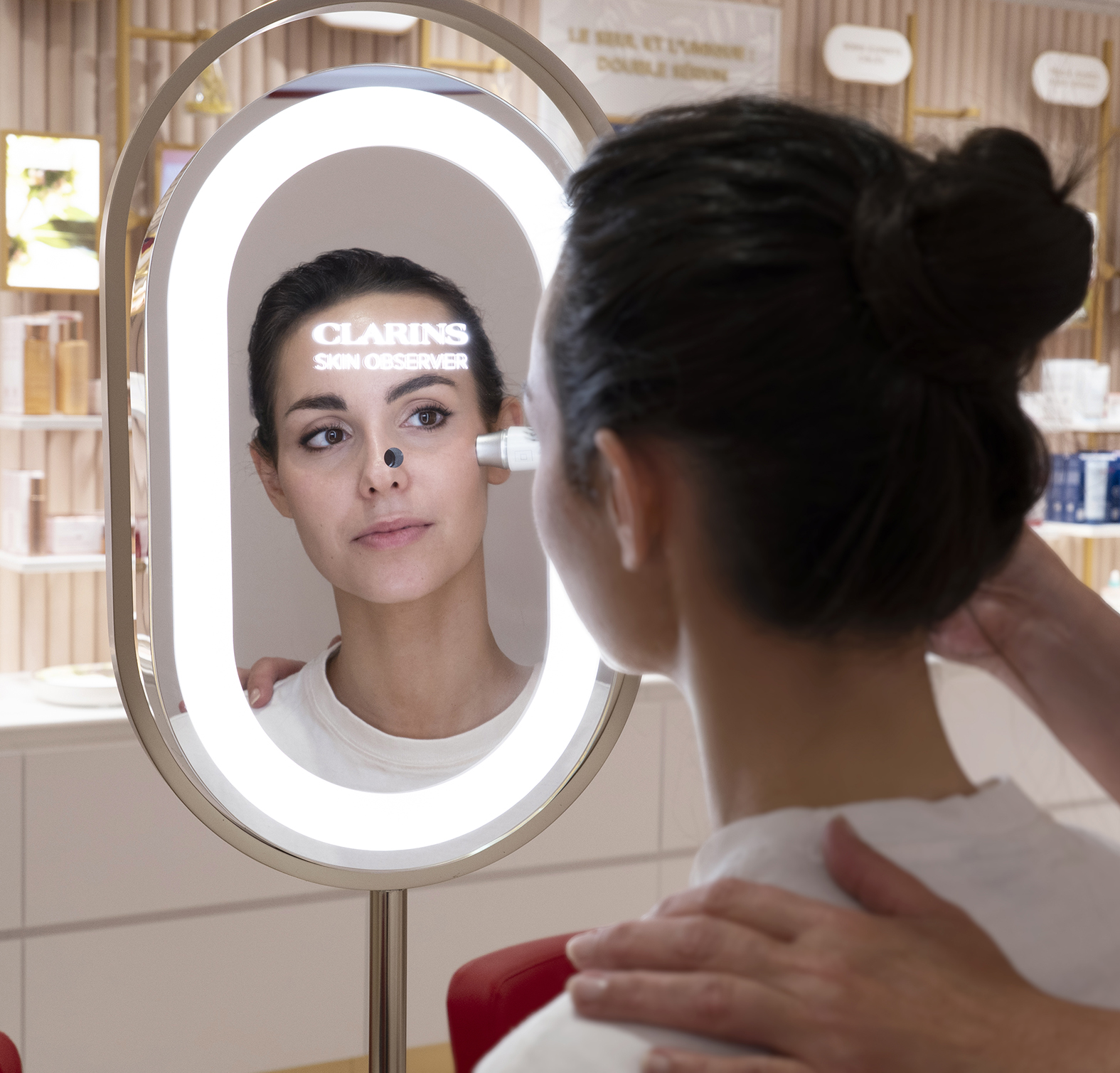 AI Skin Observer si presenta come uno specchio, situato sui tavoli di consultazione dei corner Clarins.