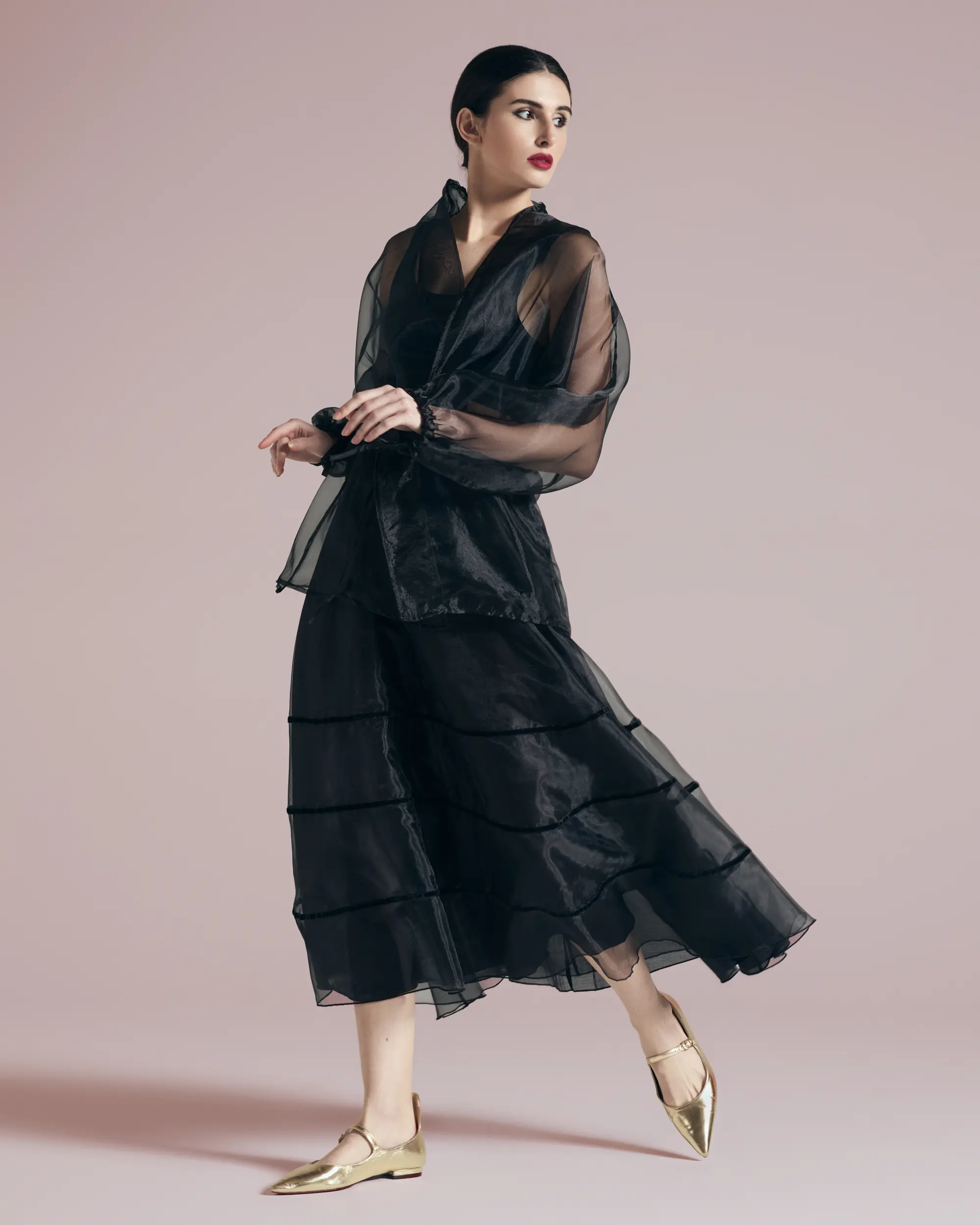 La quotidianità trova una nuova eleganza nelle proposte daily in tessuti elasticizzati, pensati per il comfort ma arricchiti da tasche lavorate che introducono carattere e grinta. I look athleisure raccontano una femminilità rilassata e consapevole; la versione impreziosita da micro strass tono su tono, in nero, aggiunge una luminosità discreta e quasi notturna. I materiali diventano superficie espressiva: tessuti spalmati luminosi, taffetà frusciante con tagli costruiti, organze leggere che sfiorano il corpo. Il raso con stampa sfumata attraversa la collezione come una linea di energia in trasformazione, un passaggio continuo dallo scuro alla luce che racconta movimento, evoluzione e libertà. Le camicie over in popeline di cotone, con colli costruiti, chiudono il guardaroba con un gesto netto e contemporaneo, pensato per un corpo che sceglie come abitare lo spazio.
