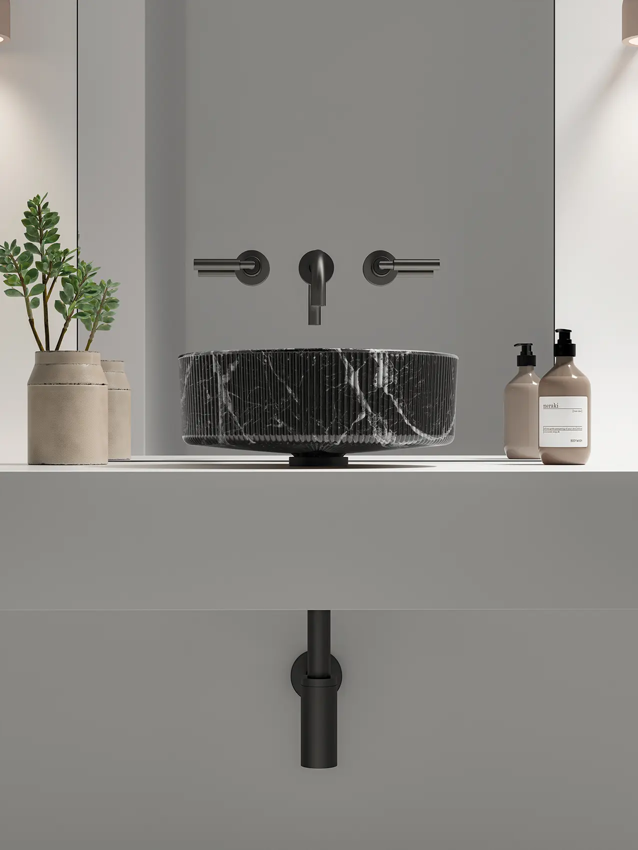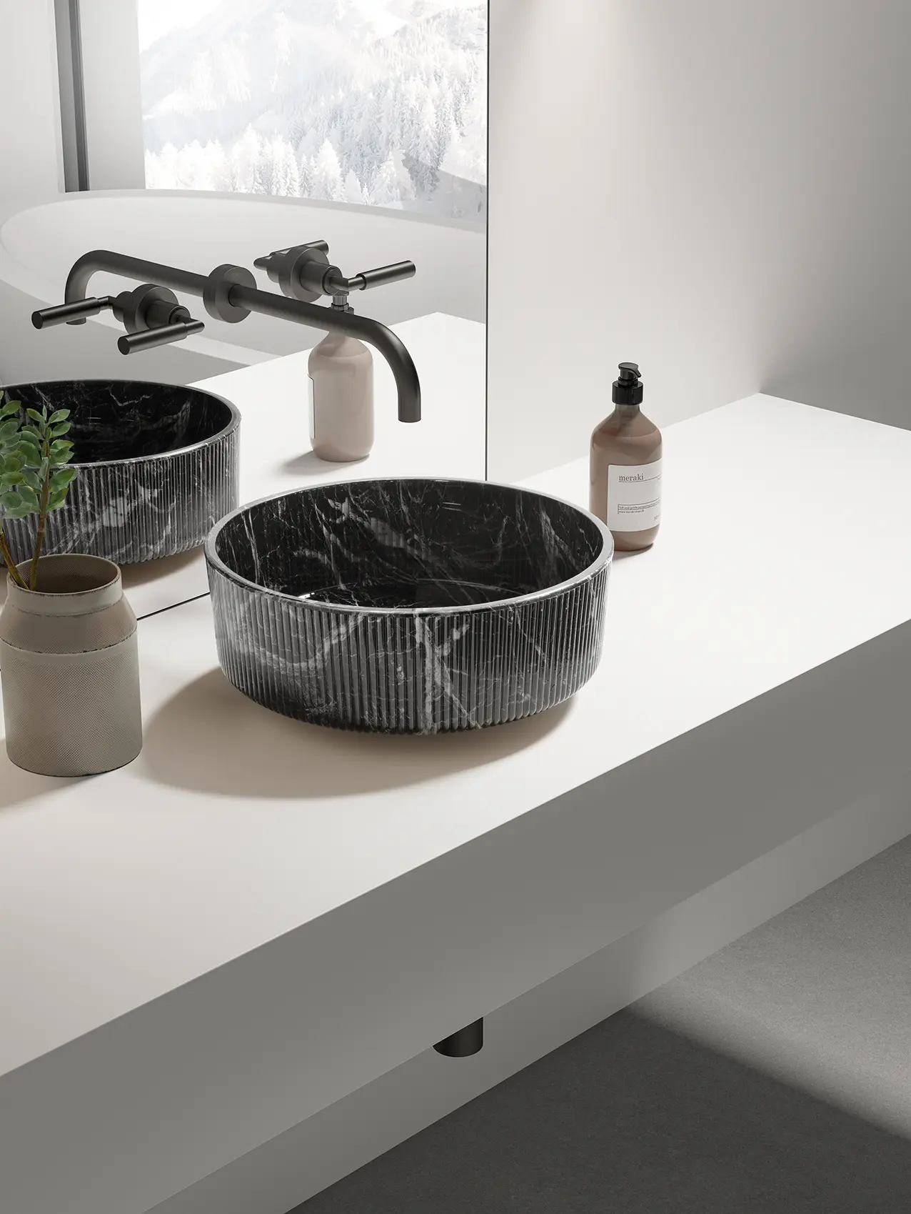 Un risultato reso possibile dall’abilità dei mastri vetrai e dall’esclusiva lavorazione Glass Design, che consente di ottenere effetti decorativi e formali irraggiungibili con il marmo tradizionale. In particolare, la scanalatura esterna che caratterizza il corpo del lavabo – elemento distintivo e altamente scenografico – sarebbe quasi impossibile da realizzare su un blocco di pietra naturale. Nel vetro, invece, diventa un segno di design preciso, regolare e sofisticato.
