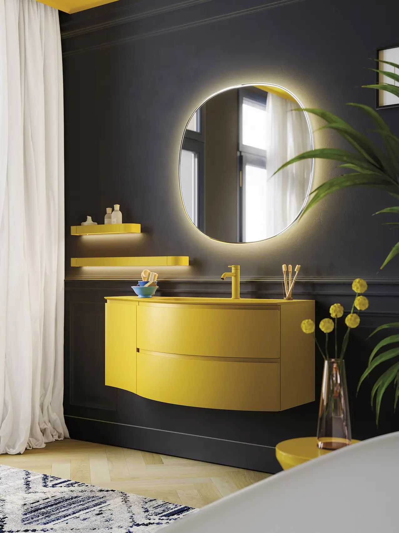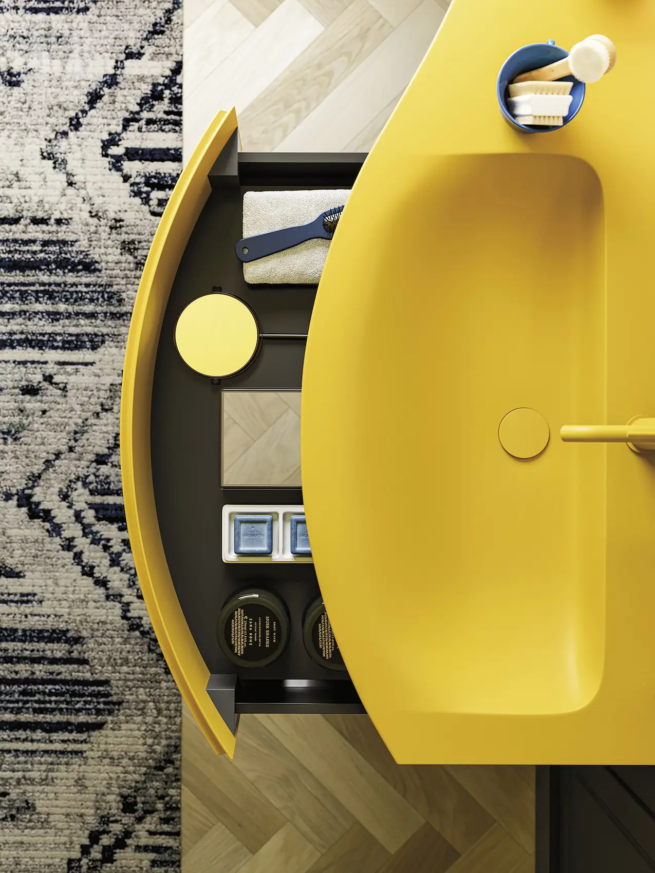 Il segno distintivo di Fusion è dato dalle linee curve delle basi. Una scelta progettuale che non è solo decorativa: le rotondità e i terminali slim con profondità ridotta contribuiscono a migliorare la fruibilità degli spazi, risolvendo esigenze concrete come il passaggio in bagni compatti o l’ottimizzazione di nicchie, oltre a ridurre ingombri e spigoli nelle zone più operative.
