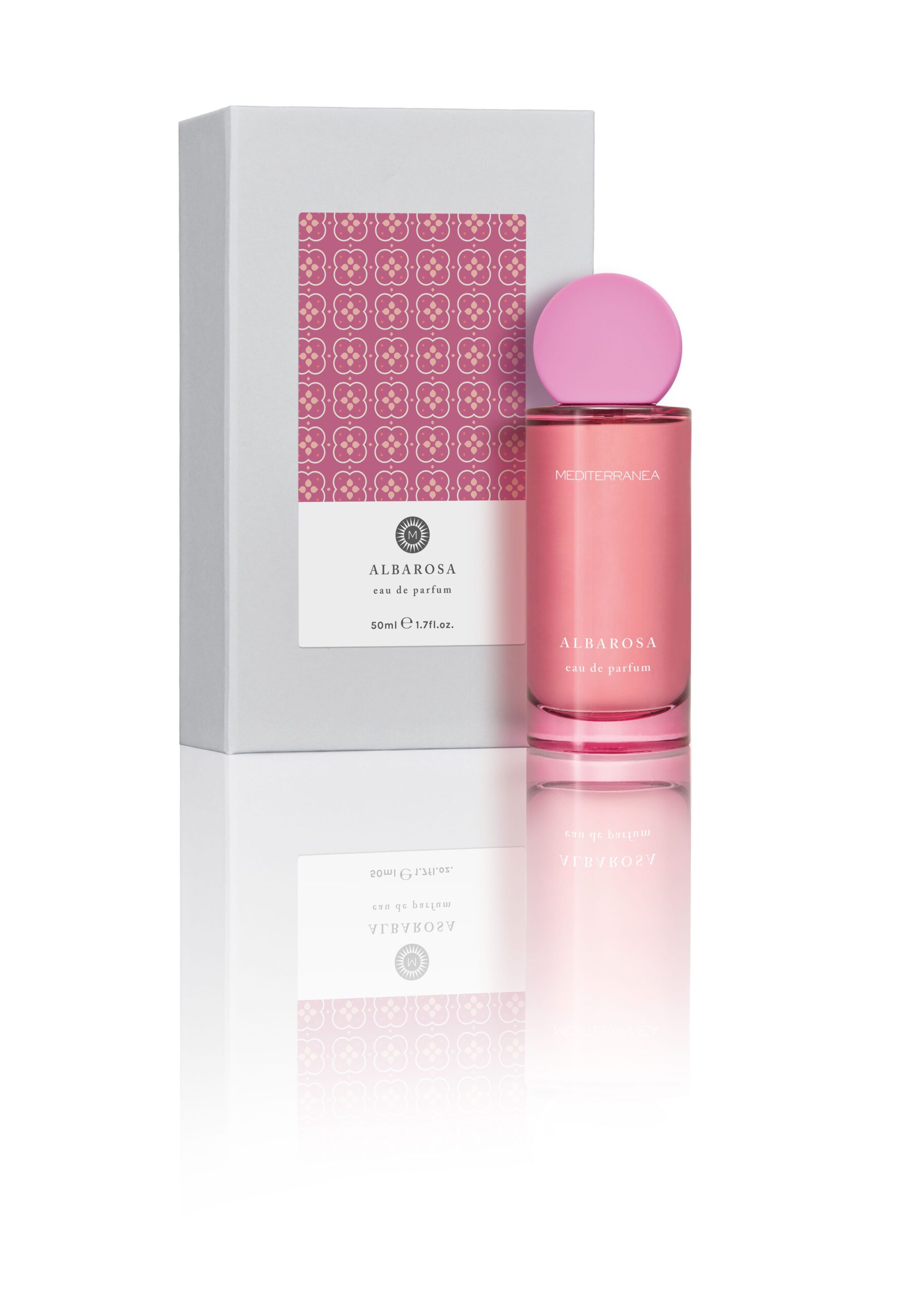 Una ricchezza e una pluralità di note aromatiche che trova il suo denominatore comune nell’Elicriso, pianta tipica della macchia mediterranea. Sei profumi raffinati e originali, sei fragranze golose, delicate, profonde o esplosive, sei racconti di viaggio. Questo è il racconto di Albarosa, un profumo dolce e fiorito che avvolge con delicatezza. In Albarosa le note agrumate e fruttate del Bergamotto di Calabria, dell’Arancio dolce di Sicilia e della Pesca bianca evolvono in un cuore di Gelsomino, Eliotropio, Patchouli e Lillà, temperato dall’aroma del Legno Cedrino. Un fondo di Ambra, Muschio bianco e Bacche di Vaniglia completa e dà spessore alla fragranza.