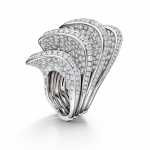 Rita Ora ha indossato gli iconici orecchini Boule in oro bianco con 1.448 diamanti bianchi taglio brillante, abbinati all’anello Onde in oro bianco con 666 diamanti bianchi e all’anello Vortice in oro bianco con 47 diamanti bianchi.